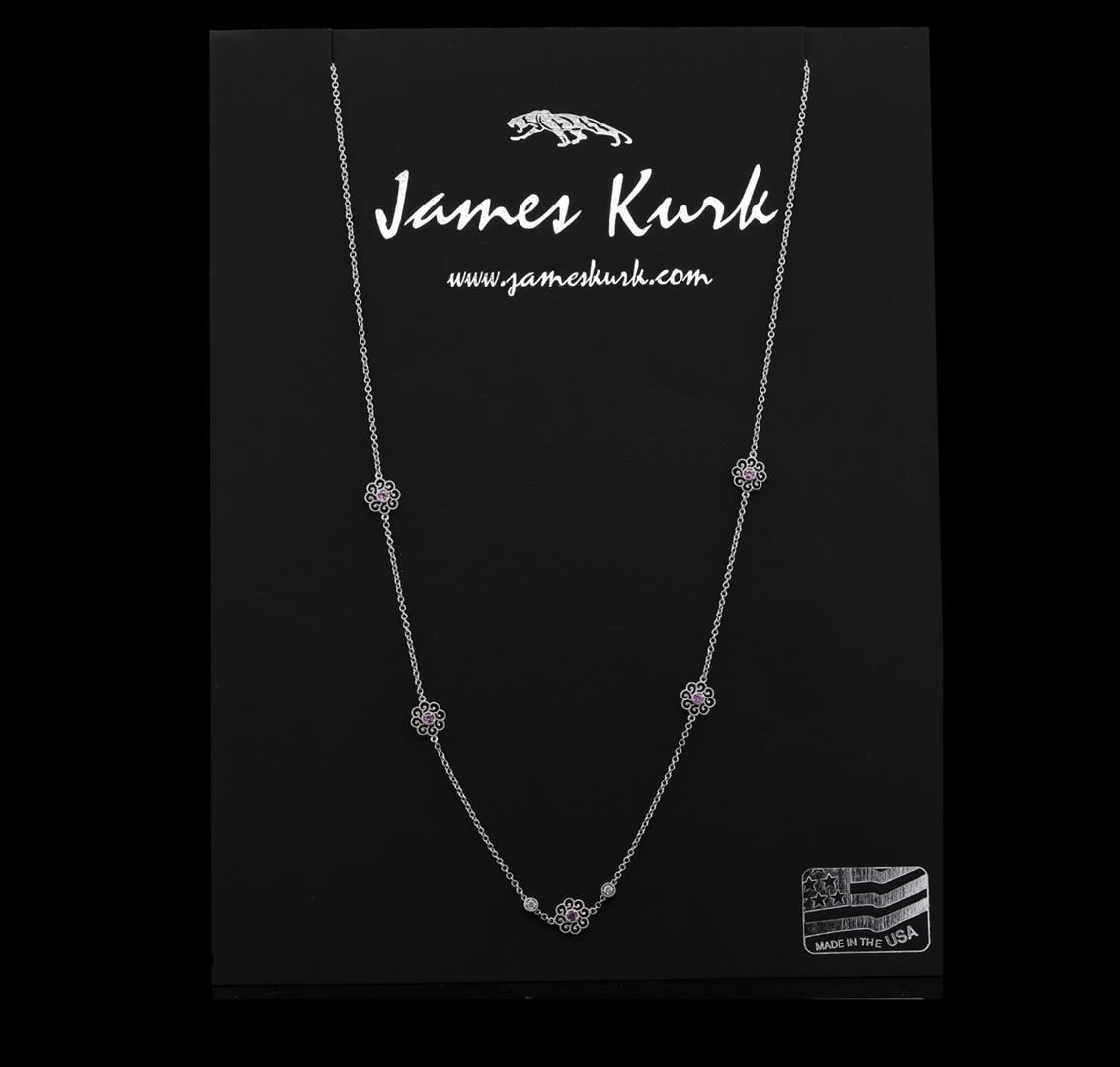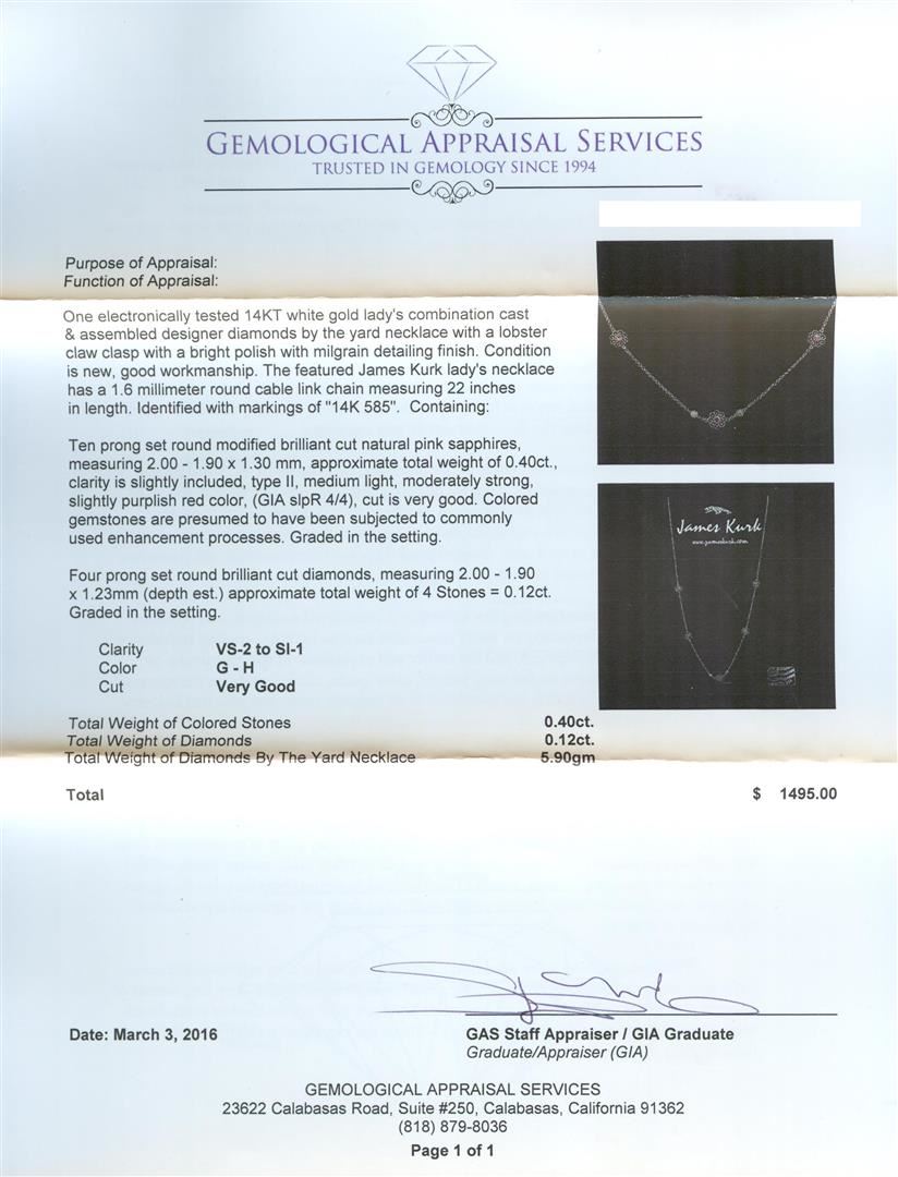 One electronically tested 14KT white gold lady's combination cast & assembled designer diamonds by the yard necklace with a lobster claw clasp with a bright polish with milgrain detailing finish. Condition is new, good workmanship. The featured James Kurk lady's necklace has a 1.6 millimeter round cable link chain measuring 22 inches in length. Identified with markings of "14K 585". Containing: Ten prong set round modified brilliant cut natural pink sapphires, measuring 2.00 x 1.90 x 1.30mm, approximate total weight of 0.40ct., clarity is slightly included, type II, medium light, moderately strong, slightly purplish red color, (GIA slpR 4/4), cut is very good. Colored gemstones are presumed to have been subjected to commonly used enhancement processes. Graded in the setting. Four prong set round brilliant cut diamonds, measuring 2.00 - 1.90 x 1.23mm (depth est.) approximate total weight of 4 Stones = 0.12ct. Graded in the setting. Clarity: VS-2 to SI-1. Color: G - H. Cut: Very good. Total Weight of Colored Stones: 0.40ct. Total Weight of Diamonds: 0.12ct. Total Weight of Necklace: 5.90 grams. GAS Appraised at $1,495.00.