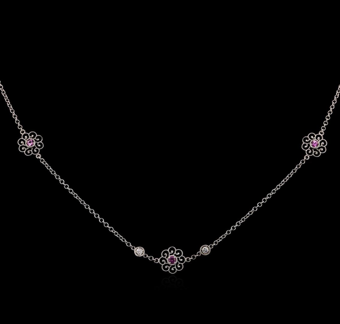 One electronically tested 14KT white gold lady's combination cast & assembled designer diamonds by the yard necklace with a lobster claw clasp with a bright polish with milgrain detailing finish. Condition is new, good workmanship. The featured James Kurk lady's necklace has a 1.6 millimeter round cable link chain measuring 22 inches in length. Identified with markings of "14K 585". Containing: Ten prong set round modified brilliant cut natural pink sapphires, measuring 2.00 x 1.90 x 1.30mm, approximate total weight of 0.40ct., clarity is slightly included, type II, medium light, moderately strong, slightly purplish red color, (GIA slpR 4/4), cut is very good. Colored gemstones are presumed to have been subjected to commonly used enhancement processes. Graded in the setting. Four prong set round brilliant cut diamonds, measuring 2.00 - 1.90 x 1.23mm (depth est.) approximate total weight of 4 Stones = 0.12ct. Graded in the setting. Clarity: VS-2 to SI-1. Color: G - H. Cut: Very good. Total Weight of Colored Stones: 0.40ct. Total Weight of Diamonds: 0.12ct. Total Weight of Necklace: 5.90 grams. GAS Appraised at $1,495.00.