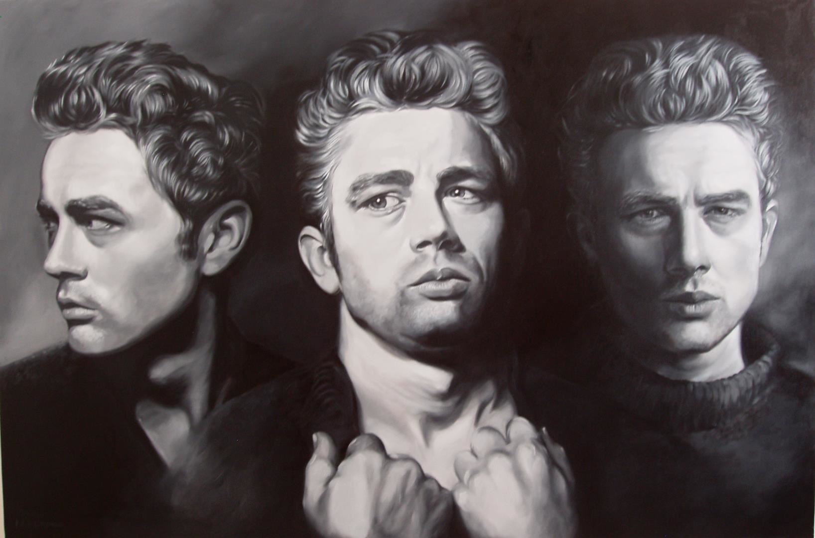 An original 40x60" oil triptych of James Dean by Margaret Korona on stretched canvas, signed by Artist ; with COA by Artist