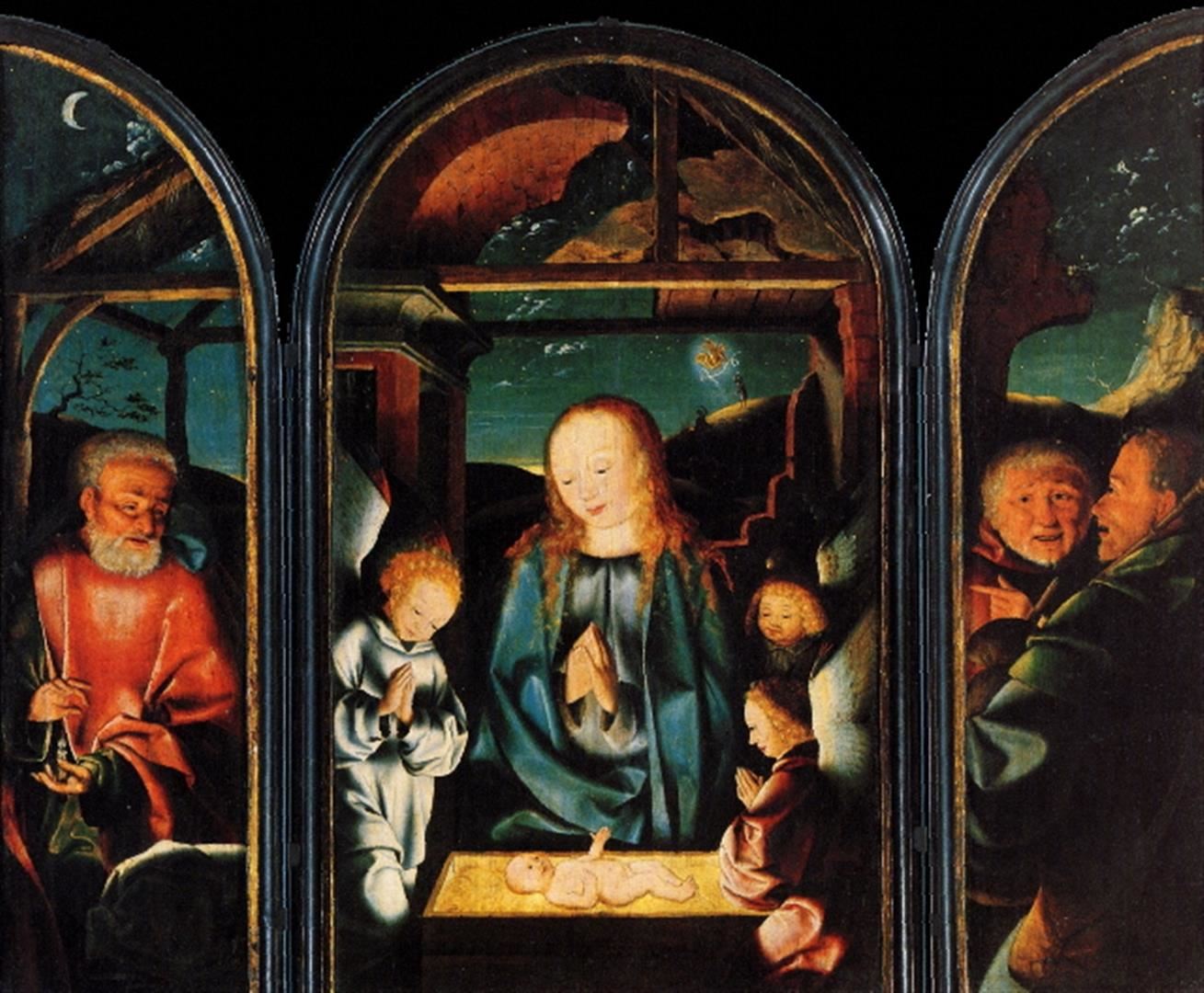 Artist: Jan Joest of Kalkar - Title: Adoration of the Christ Child - Medium: Fine Art Giclee on Canvas - Image Size: Approximately 20 inches x 16.5 inches - Unframed on Unstretched Canvas - Biography: Jan Joest, also known as Jan Joest van Kalkar or Jan Joest van Calcar (between 1450 and 1460 - 1519), was a Dutch painter from either Kalkar or Wesel (both now in Germany), known for his religious paintings.