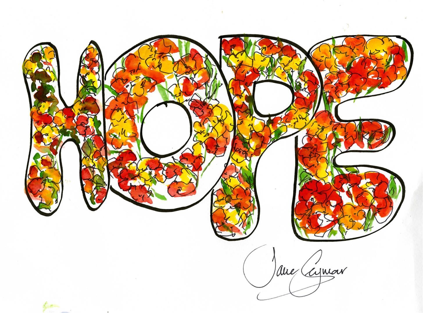 Jane SEYMOUR: HOPE Series II. HOPE with Flowers . Watercolor with pen and ink on paper, signed lower right, 9 1/8 x 11 1/4" A message of Hope was given by a series of watercolors on the theme, created during the Covid-19 pandemic.