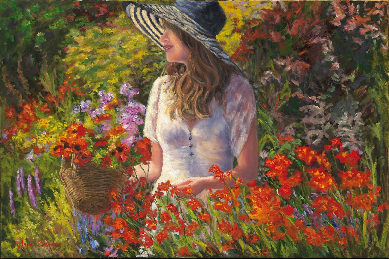 Jane SEYMOUR ORIGINAL: The Artist in Her English Garden. A limited-edition giclee on canvas, hand-signed by the artist, and numbered verso #48/150, 21 3/4 x 33" This quintessential Jane SEYMOUR ORIGINAL image marries her love of gardens, flowers and nature in a pleasing and timeless self-portrait.