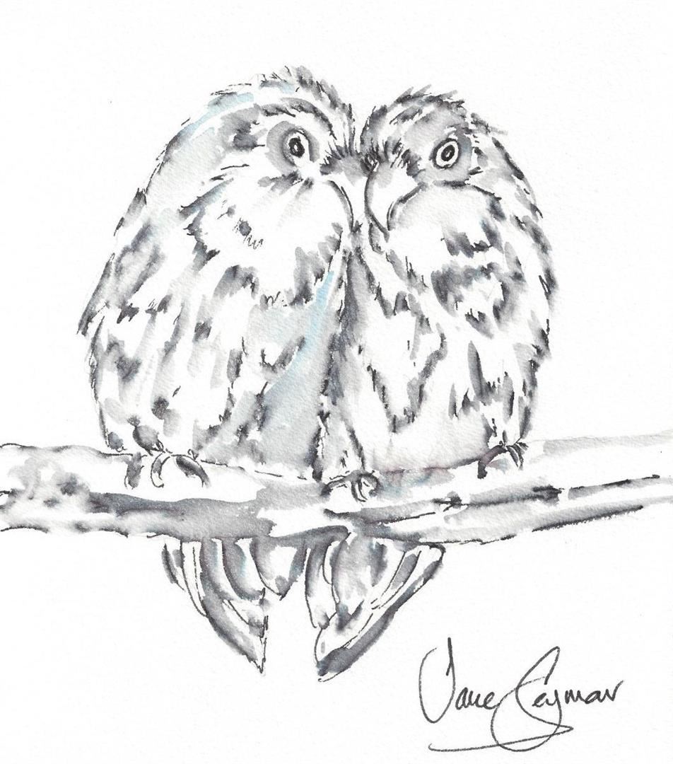 Jane SEYMOUR ORIGINAL: The Love Birds VII.. Watercolor with pen and ink on paper, signed lower right, 10 x 8" A delightful pair of Love Birds in the artist's signature style.