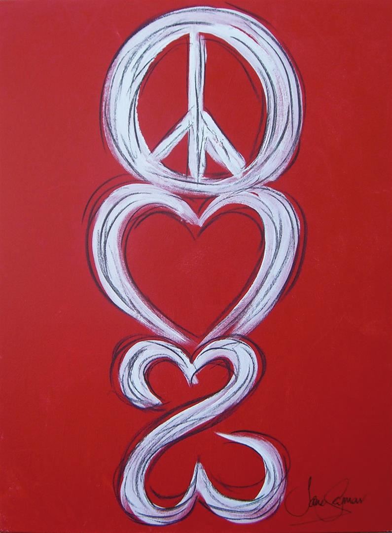 Jane SEYMOUR: Peace, Love and an Open Heart Stacked V. (Large). Original mixed-media on canvas, signed lower right, 24 x 18" FR: 34 x 28" A beautiful and simple depiction of the universal symbols of Peace and Love, with the iconic Jane Seymour Open Heart image added to the inspirational message.