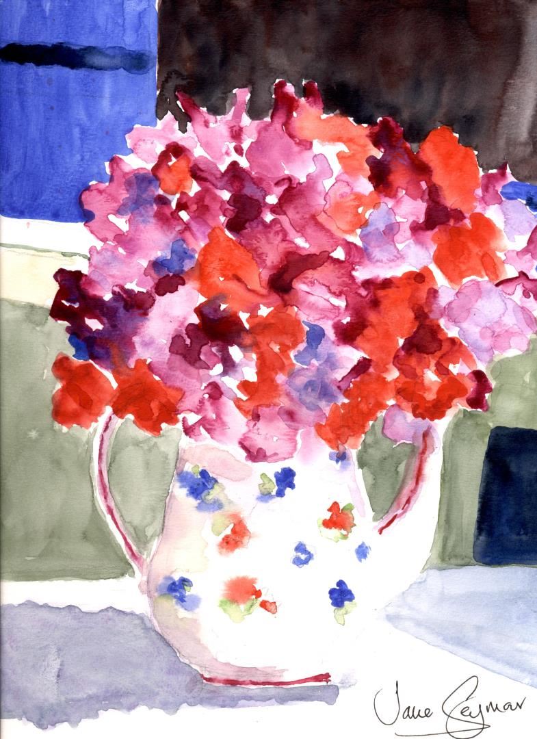 Watercolor on Canson artist board, signed lower right by Jane Seymour ; 12 x 9" Recurring theme of sweet peas bouquet in Jane's floral tea pot