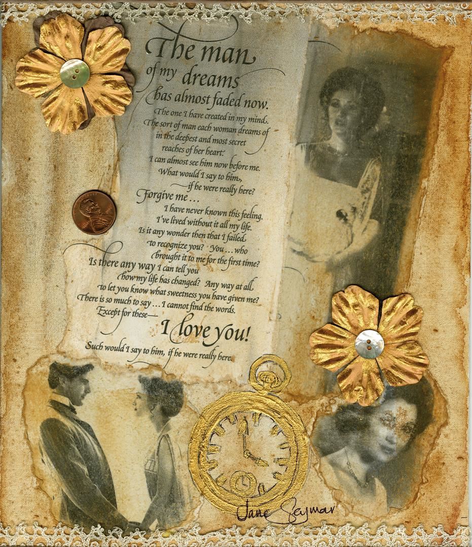 Jane SEYMOUR: "The Man of My Dreams" - "Somewhere in Time". Original mixed-media collage on board, with hand-painting, signed lower right, 8 1/4 x 10" FR: 17 x 15" A hand-made collage featuring the world-famous soliloquy recited by character Elise McKenna (Jane Seymour) from the cult favorite film "Somewhere in Time" with Christopher Reeve