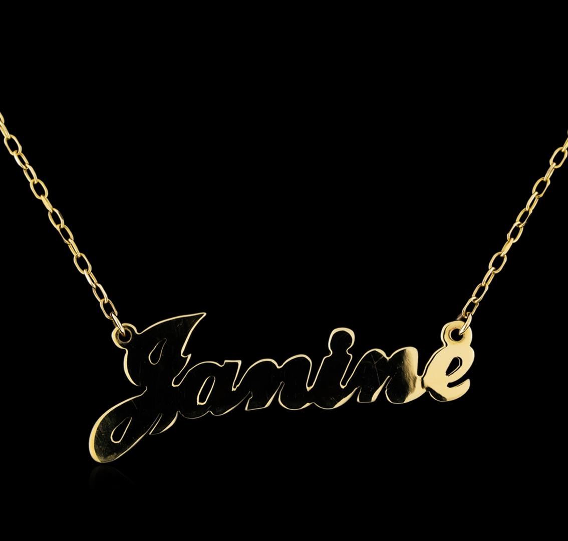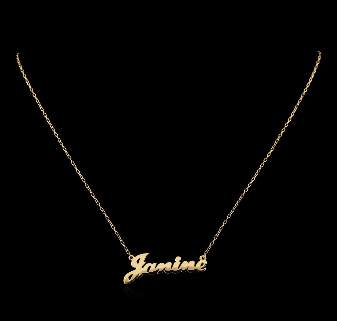 One Janine name tag pendant with chain: 14KT yellow gold weighing 4.25gm.
