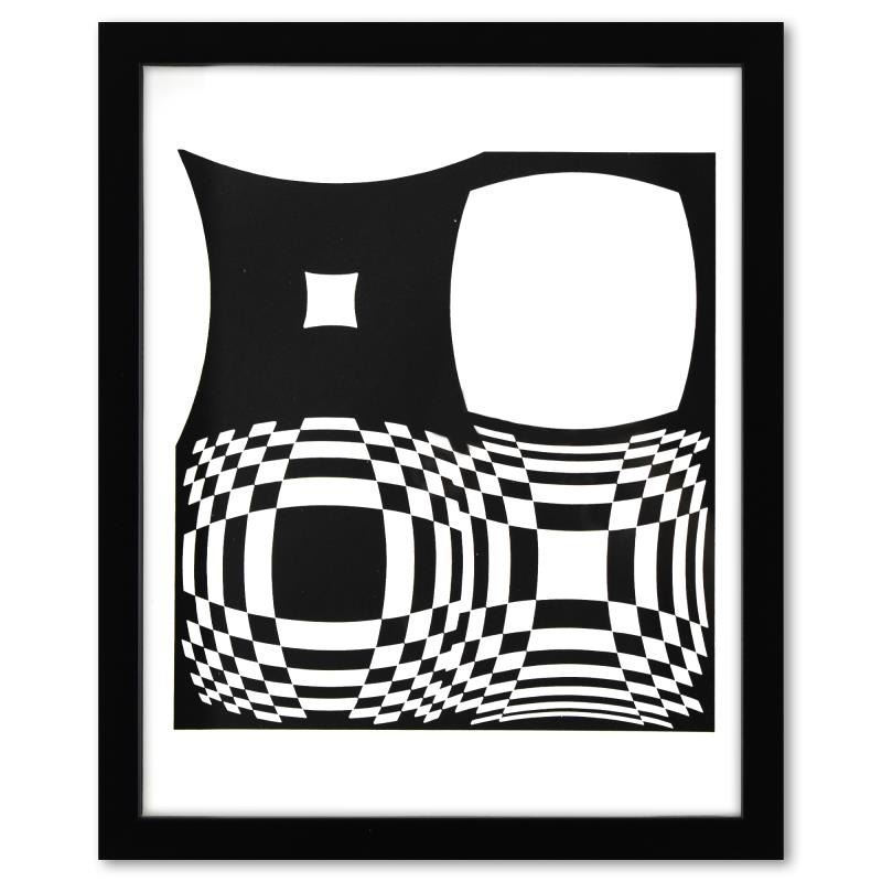 "Japet de la serie Croises" is a heliogravure print on paper, published in 1973, by Victor Vasarely (1908-1997). This piece comes custom framed, with a letter of authenticity and with a 1976 Vasarely paperback. Measures approx. 12.5" x 15" (frame), 10" x 13" (image).