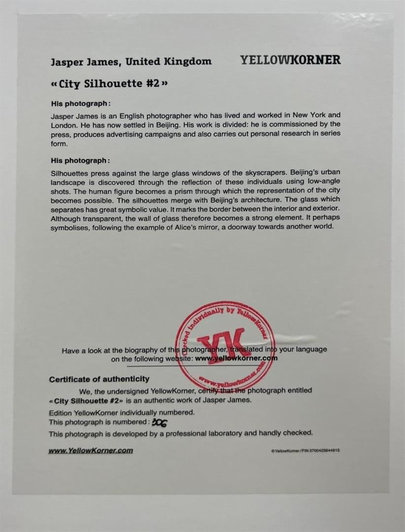 Jasper James City Silhouette #2 Bejing China YellowKorner Certified Photograph. Certificate of Authenticity from YellowKorner affixed to the back. Matted Dimensions 16"x20". Protected with Clear Mylar Sleeve.