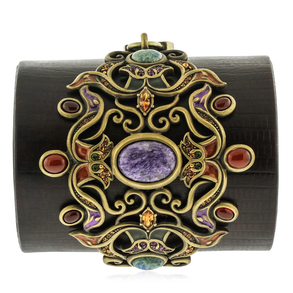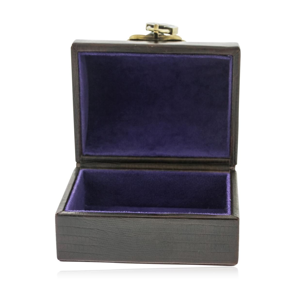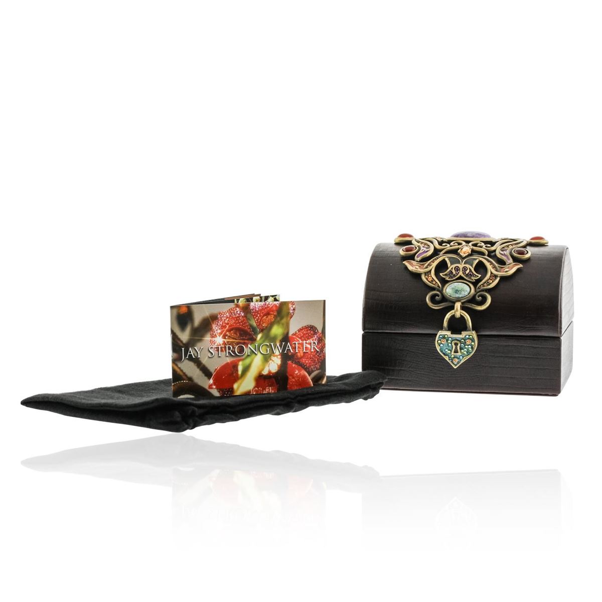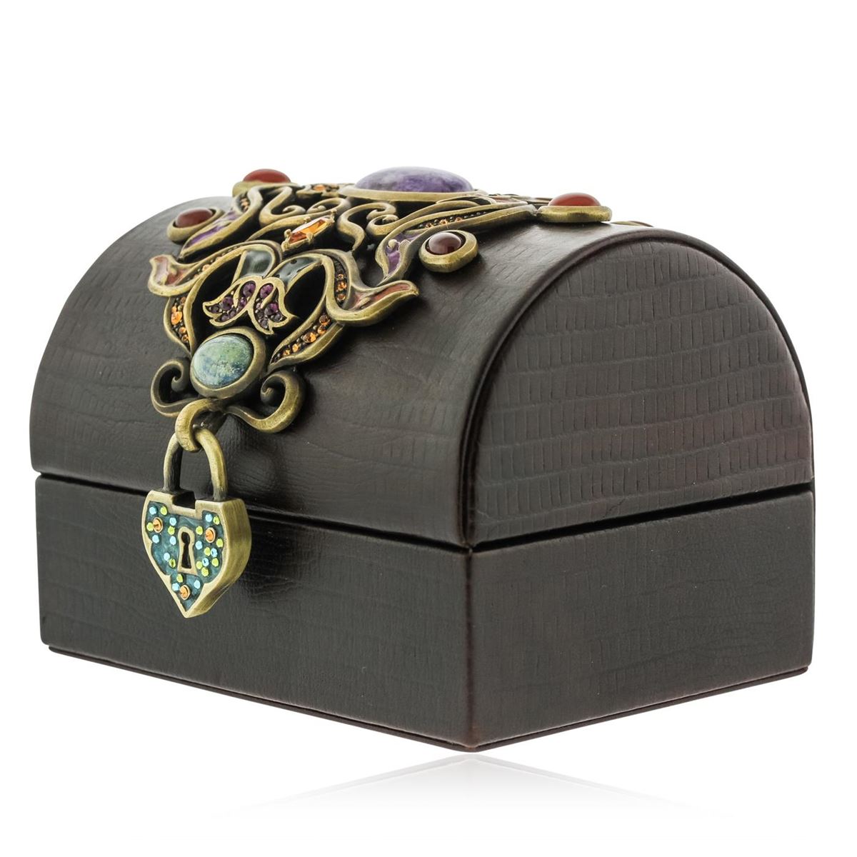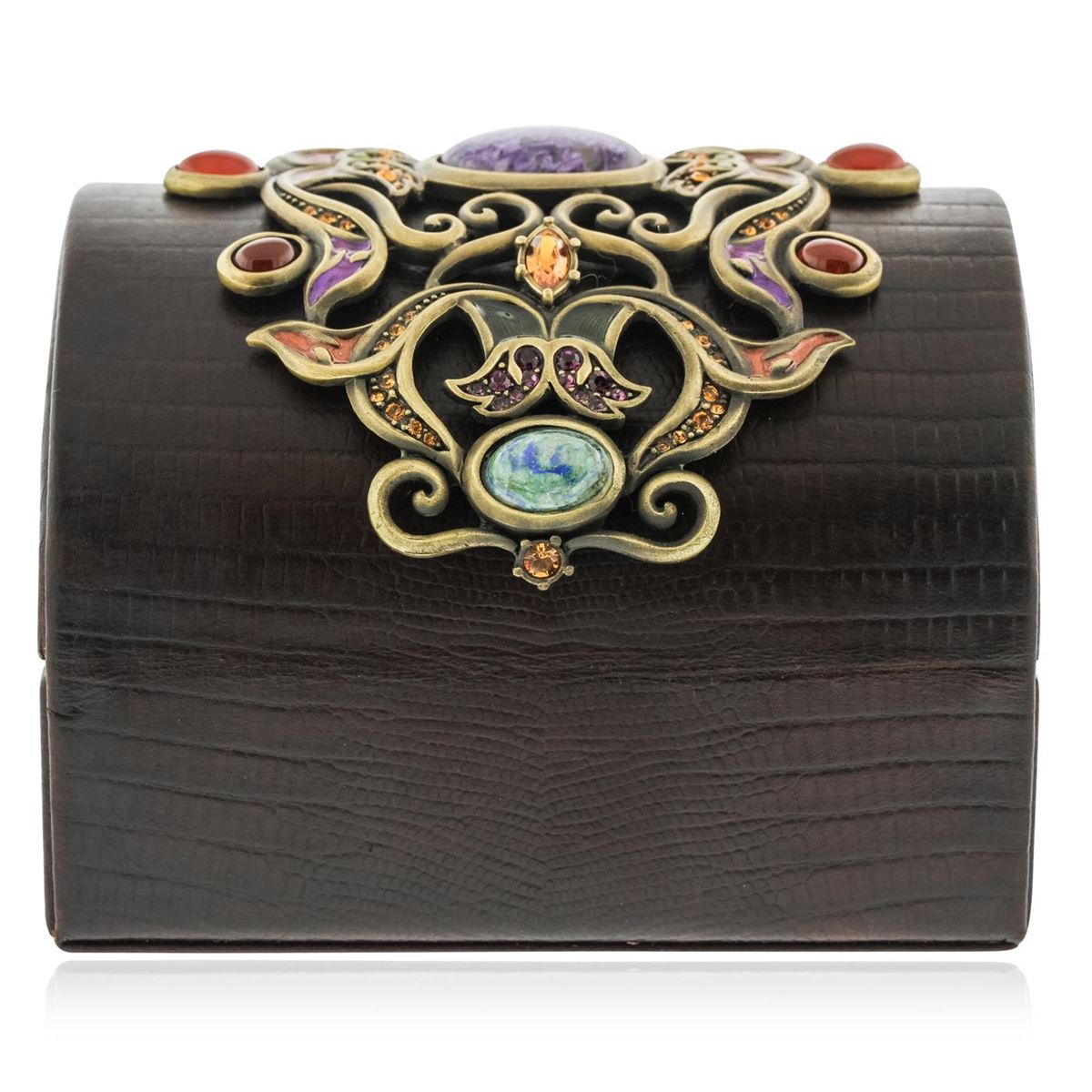 One Jay Strongwater jeweled leather treasure chest featuring hand carved metal decorations finished with translucent olivine and amber enamels. Containing: tiger eye, malachite, and carnelian semi precious cabochons. Dimensions of chest 4.5 X 3.25 X 3.5.