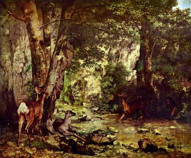 Artist: Jean Desire Gustave Courbet - Title: Deer in the Woods - Medium: Fine Art Reproduction Giclee on Canvas - Image Size: Approximately 16.5 inches x 20 inches - Unframed on Unstretched Canvas - Biography: Jean Desire Gustave Courbet (10 June 1819 - 31 December 1877) was a French painter who led the Realism movement in 19th-century French painting. Committed to painting only what he could see, he rejected academic convention and the Romanticism of the previous generation of visual artists. His independence set an example that was important to later artists, such as the Impressionists and the Cubists. Courbet occupies an important place in 19th-century French painting as an innovator and as an artist willing to make bold social statements through his work.