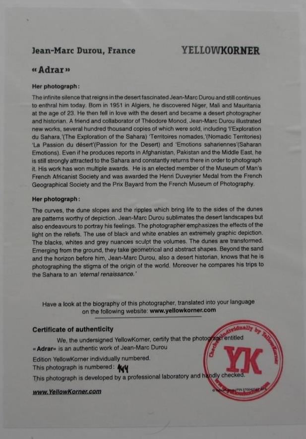 Adrar Certified Photograph, Jean-Marc Durou YellowKorner Certified Photograph. Certificate of Authenticity from YellowKorner affixed to the back. Matted Dimensions 16"x20". Protected with Clear Mylar Sleeve.