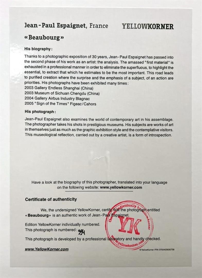 Jean Paul Espaignet BeauBourg Centre Pompidou YellowKorner Certified Photograph. Certificate of Authenticity from YellowKorner affixed to the back. Matted Dimensions 16"x20". Protected with Clear Mylar Sleeve.