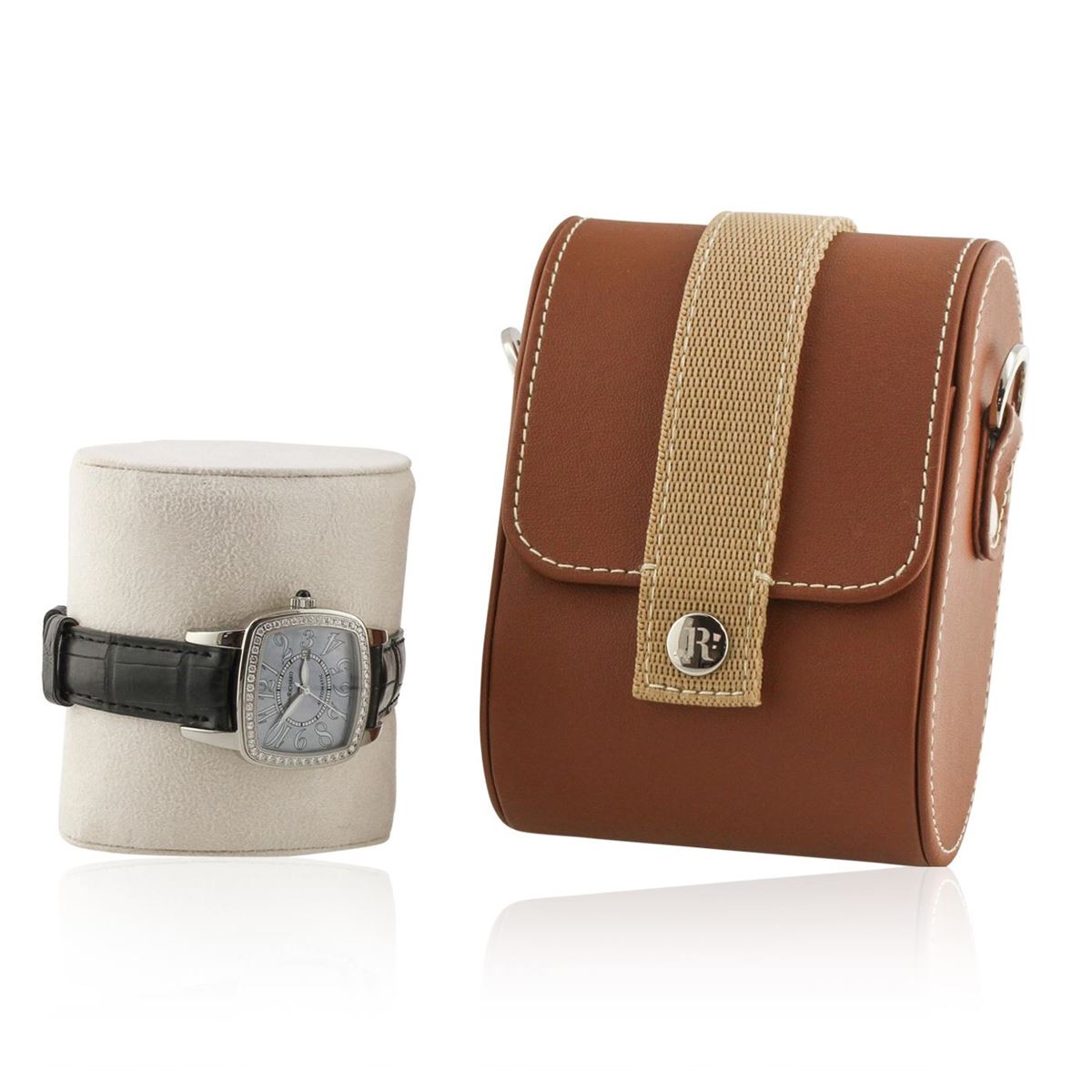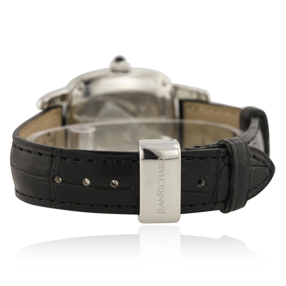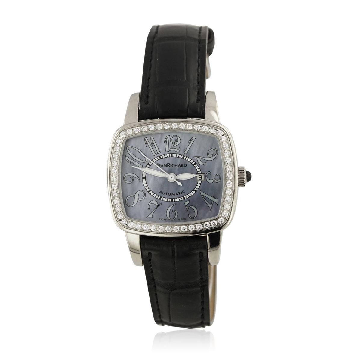 One ladies Jean Richard Wristwatch featuring: Automatic Movement, Diamond Bezel, Stainless Steel Lugs, Case, Crown, Bezel, Black Leather Bracelet with Black Stitching, Gray Mother of Pearl Dial with Analog Display, Green Arabic Numerals, Date at 3 o'clock position. Watch weighs a total of 53.2 grams.