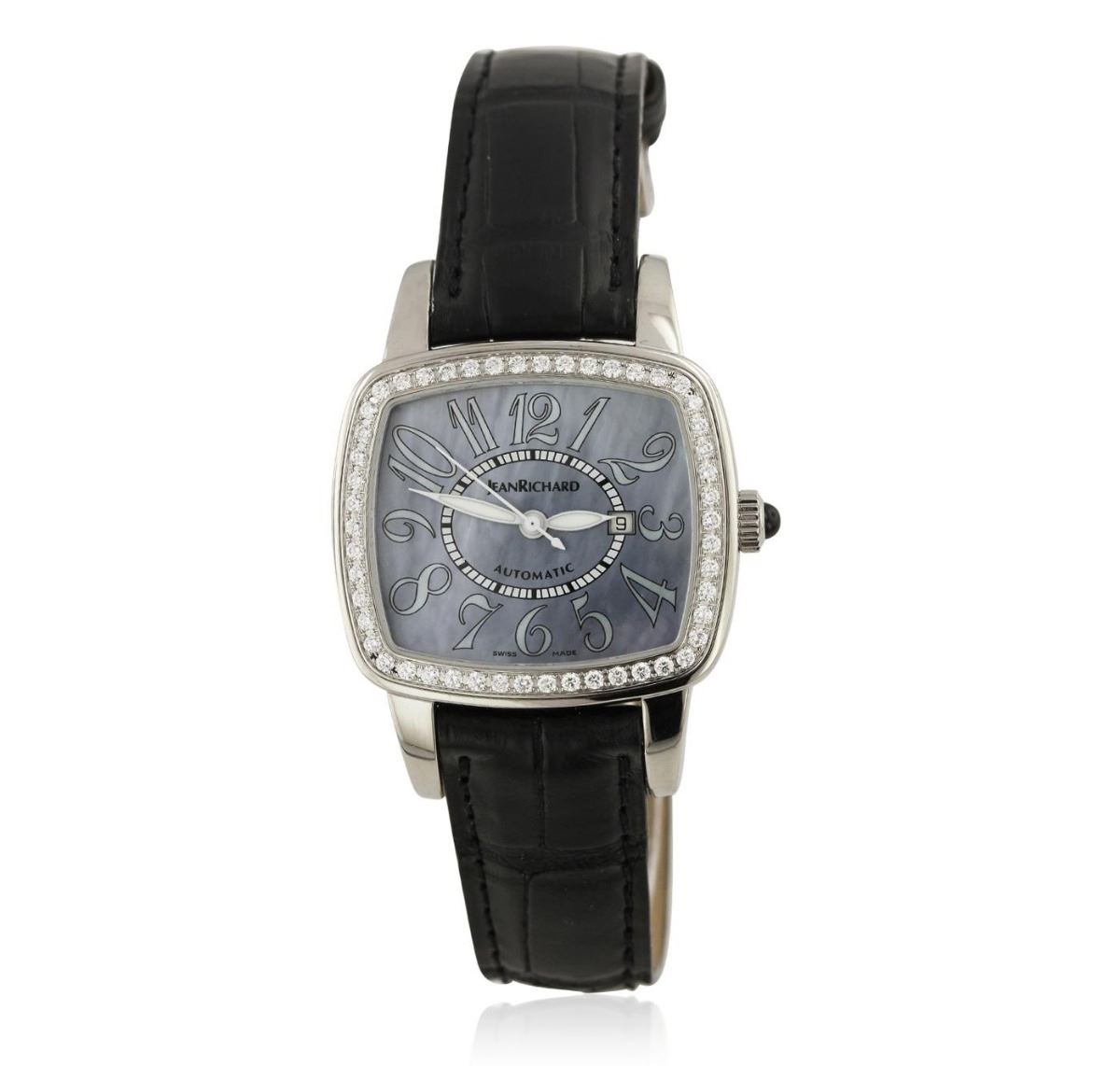 One ladies Jean Richard Wristwatch featuring: Automatic Movement, Diamond Bezel, Stainless Steel Lugs, Case, Crown, Bezel, Black Leather Bracelet with Black Stitching, Gray Mother of Pearl Dial with Analog Display, Green Arabic Numerals, Date at 3 o'clock position. Watch weighs a total of 53.2 grams.