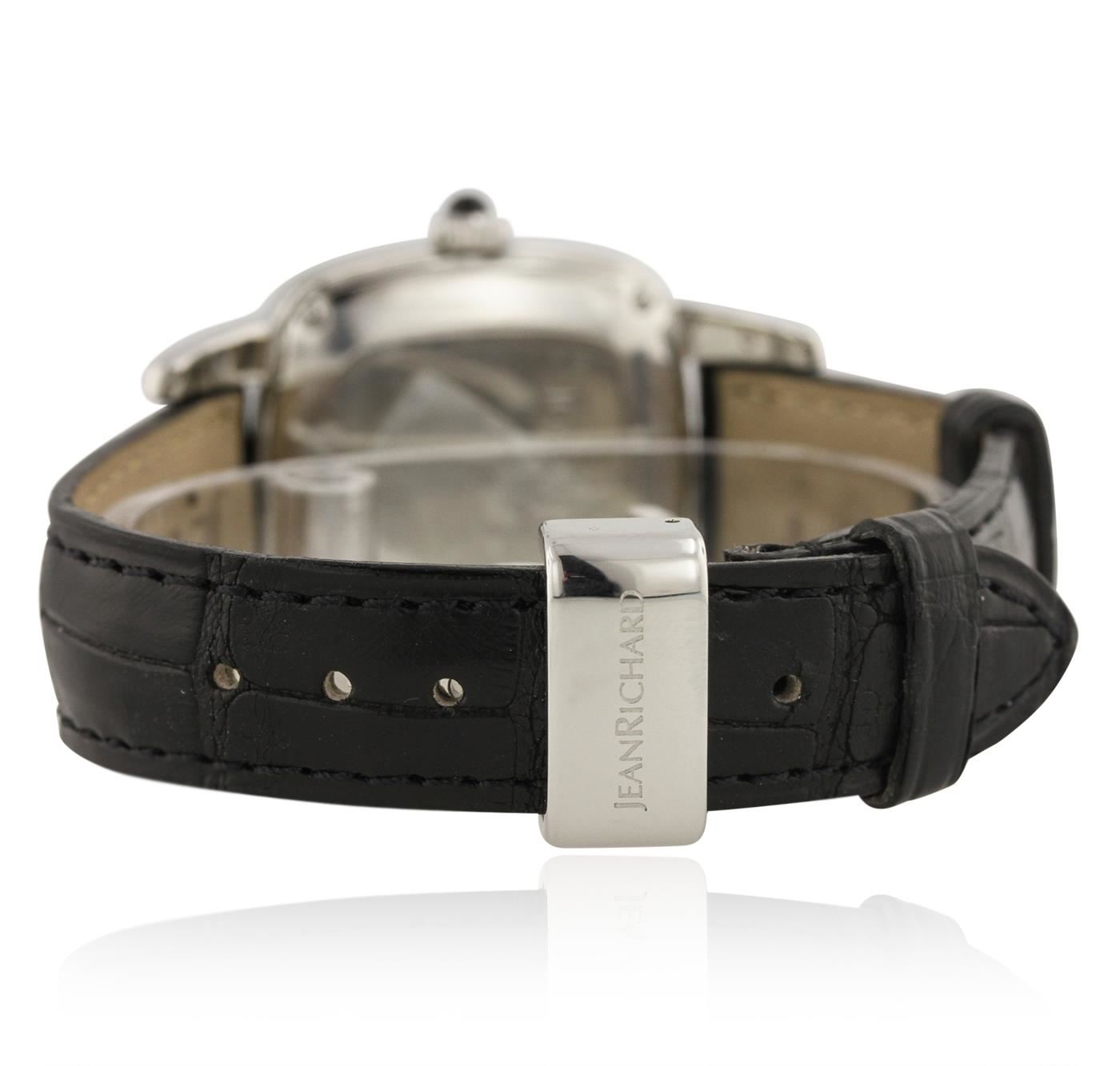One ladies Jean Richard Wristwatch featuring: Automatic Movement, Diamond Bezel, Stainless Steel Lugs, Case, Crown, Bezel, Black Leather Bracelet with Black Stitching, Gray Mother of Pearl Dial with Analog Display, Green Arabic Numerals, Date at 3 o'clock position. Watch weighs a total of 53.2 grams.