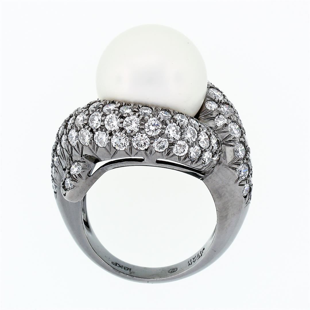 A solid 18k black gold bypass ring by Jean Vitau, with 1 round shape cultured pearl (AAA Quality; 13.43mm), surrounded with 99 round brilliant cut natural diamonds (E/F - VVS2/VS1; 3.18ctw). The ring is size 6.0, weighs a total of 14.66 grams, and measures 19.08mm wide.