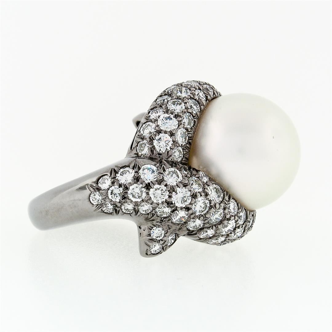 A solid 18k black gold bypass ring by Jean Vitau, with 1 round shape cultured pearl (AAA Quality; 13.43mm), surrounded with 99 round brilliant cut natural diamonds (E/F - VVS2/VS1; 3.18ctw). The ring is size 6.0, weighs a total of 14.66 grams, and measures 19.08mm wide.