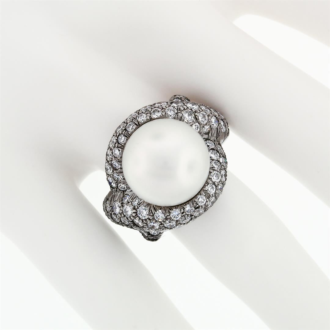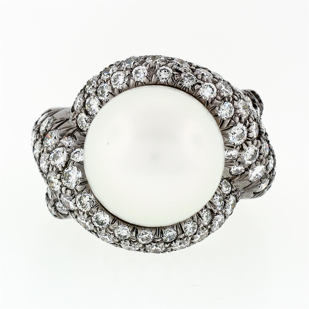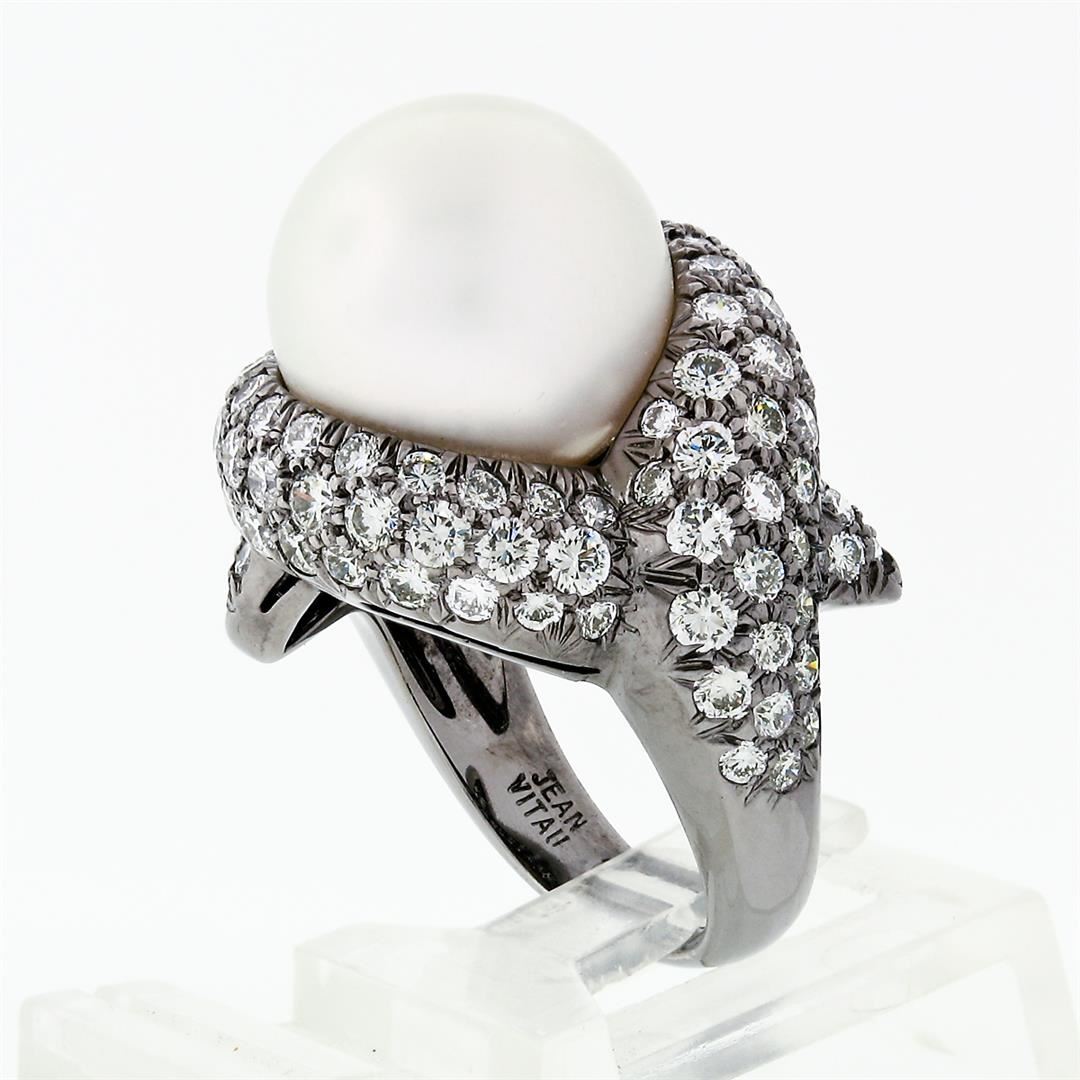 A solid 18k black gold bypass ring by Jean Vitau, with 1 round shape cultured pearl (AAA Quality; 13.43mm), surrounded with 99 round brilliant cut natural diamonds (E/F - VVS2/VS1; 3.18ctw). The ring is size 6.0, weighs a total of 14.66 grams, and measures 19.08mm wide.