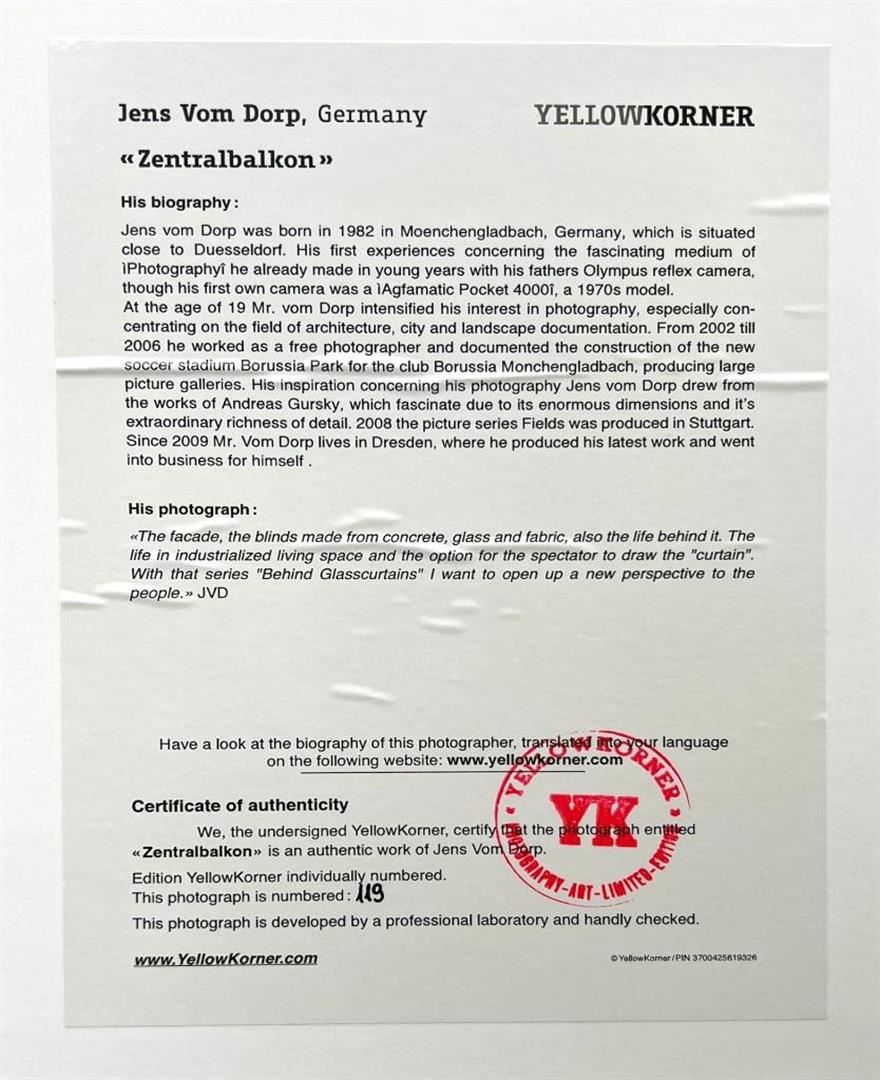 Jens Vom Dorp Germany Zentralbalkon YellowKorner Certified Photograph. Certificate of Authenticity from YellowKorner affixed to the back. Matted Dimensions 16"x20". Protected with Clear Mylar Sleeve.