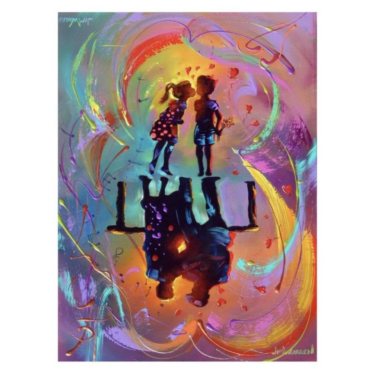 "The First Kiss" is an AP numbered, artist embellished limited edition giclee on canvas by Jim Warren. This piece is double hand signed by the artist so that it can be displayed with either side up and is accompanied by a certificate of authenticity. Measures approximately 30" x 24" (image).