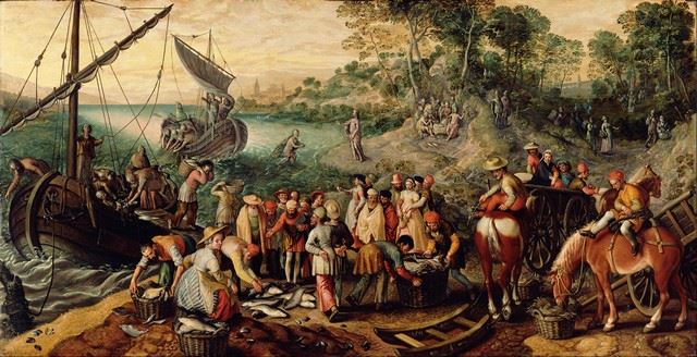 Artist: Joachim Beuckelaer - Title: The Miraculous Catch of Fishes - Medium: Fine Art Reproduction Giclee on Canvas - Image Size: Approximately 10.25 inches x 20 inches - Unframed on Unstretched Canvas - Biography: Joachim Beuckelaer was a Flemish painter specialising in market and kitchen scenes with elaborate displays of food and household equipment. He also painted still lifes with no figures in the central scene. His development of the genre of market and kitchen scenes was influential on the development of still life art in Northern Europe as well as Italy.
