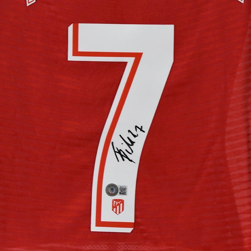 This is a replica Athletico Madrid soccer jersey autographed by Joao Felix. This piece is presented with a Certificate of Authenticity from Beckett with a QR code and certification number. Measures approx. 30" x 28" (jersey).