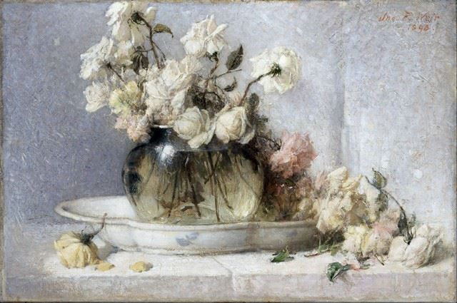 Artist: John Ferguson Weir - Title: Roses - Medium: Fine Art Giclee on Canvas - Image Size: Approximately 13.25 inches x 20 inches - Framed: Unframed on Unstretched Canvas - Biography: John Ferguson Weir (1841-1926) was an American painter, sculptor, writer, and educator. He was a son of painter Robert Walter Weir, long-time professor of drawing at the Military Academy at West Point. ... Alden Weir, also became a well-known artist who painted in the style of American Impressionism.