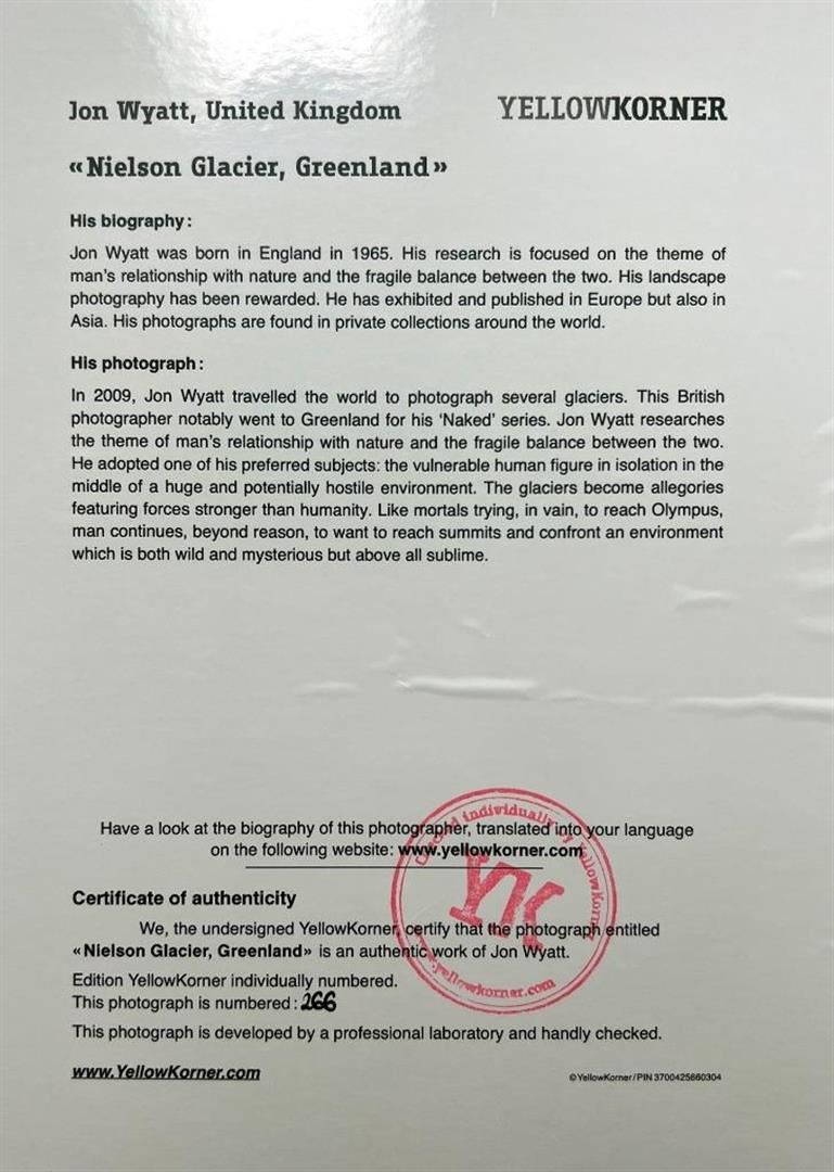 Jon Wyatt United Kingdom Nielson Glacier Greenland YellowKorner Certified Photograph. Certificate of Authenticity from YellowKorner affixed to the back. Matted Dimensions 16"x20". Protected with Clear Mylar Sleeve.