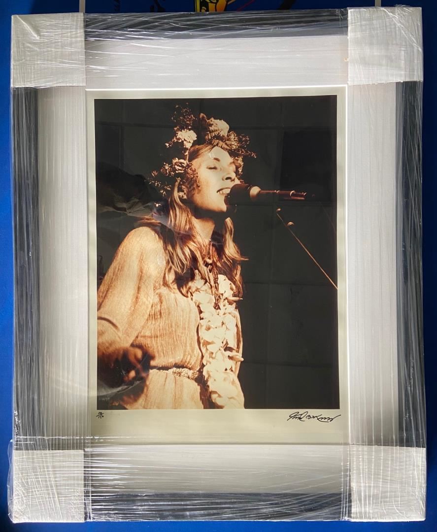 A FRAMED sepia- tone photo of Joni Mitchell signed by famed rock photographer Robert Knight. Framed it is 28x22.5",image 21x16