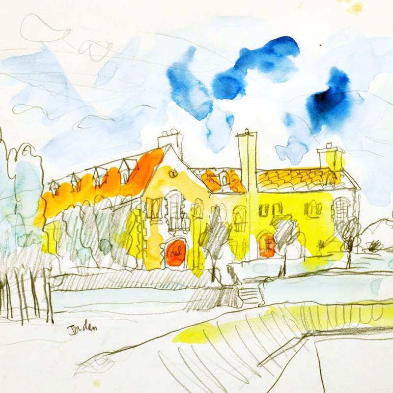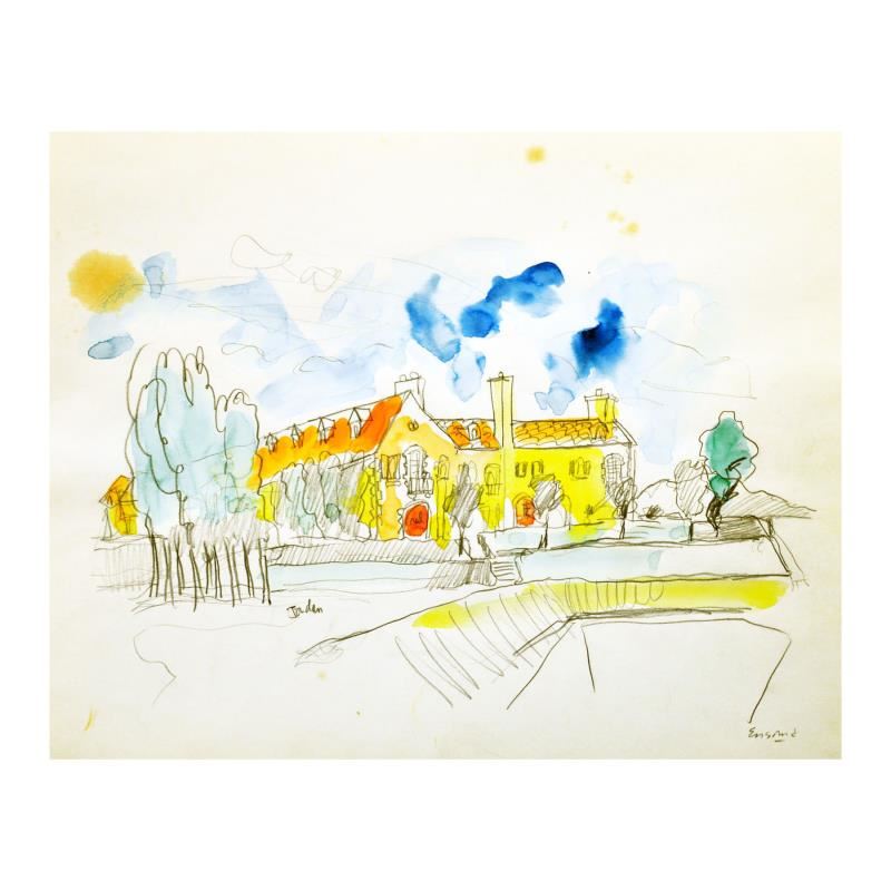 Jordan Vineyard, Napa Valley By Ensrud Original. "Jordan Vineyard, Napa Valley" is an original Mixed Media on Paper by Wayne Ensrud. The piece is hand signed by the artist and comes with a Certificate of Authenticity. Measures approximately 14" x 17".