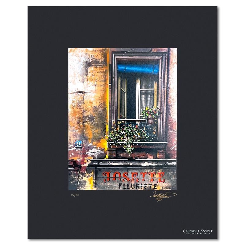 "Josette Fleuriste" is a limited edition serigraph on paper by Thomas Pradzynski (1951-2007), numbered 96/150 and hand signed by the artist. Includes Letter of Authenticity. Measures approx. 17" x 14" (border), 10.5" x 8" (image).