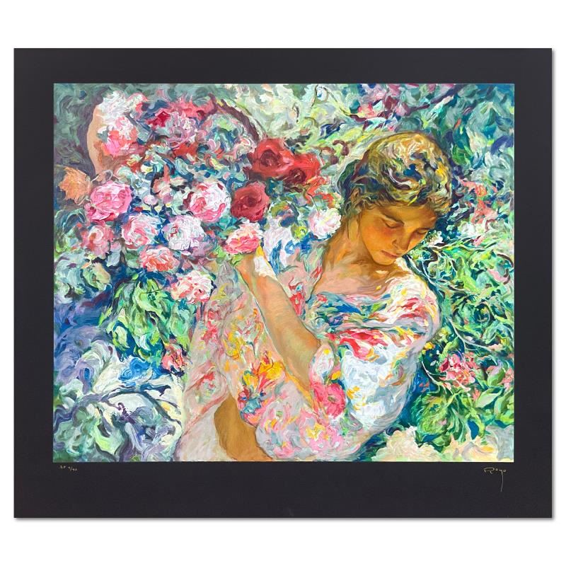 "Joven Con Costo De Flores" is a limited edition artist's proof serigraph on paper by Royo, numbered and hand signed by the artist. Includes Letter of Authenticity. Measures approx. 30.5" x 34.5" (border), 23.5" x 28.5" (image).