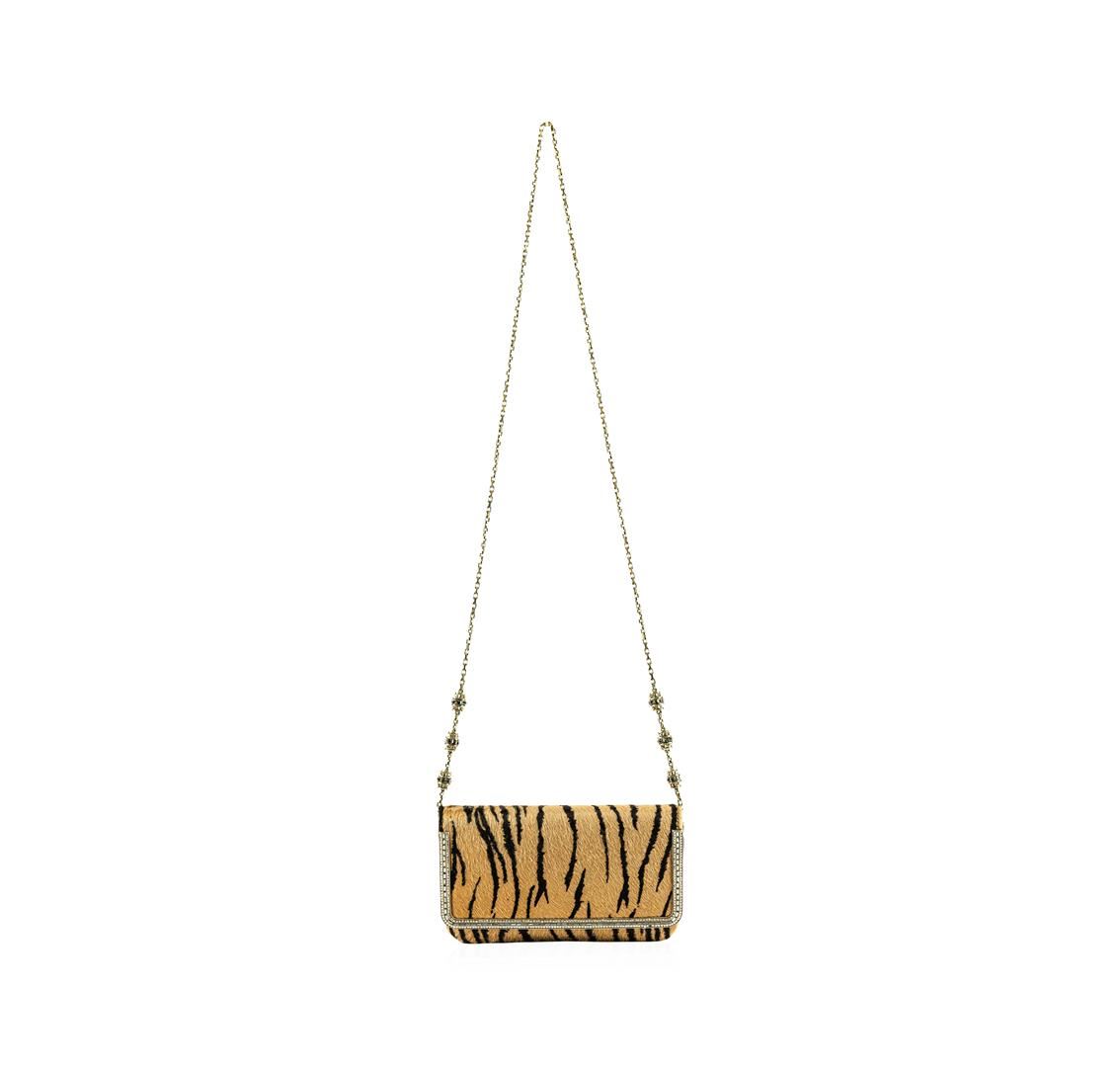 This is new with tags, dust bag and box. Judith Leiber Couture "Carmichael" calf hair clutch bag, tan/black. Details Judith leiber tiger-print dyed calf hair clutch bag. Leather trim; golden hardware. Detachable brassy golden chain strap, 14" drop. Pave rhinestone bar edges magnetic flap. Piping trims gusset sides and bottom. Rectangular east-west silhouette. Inside, satin lining and slip pocket. 5/14"H x 8 1/2" W x 1 1/2" D. "Carmichael" is made in Italy. Sold out everywhere!