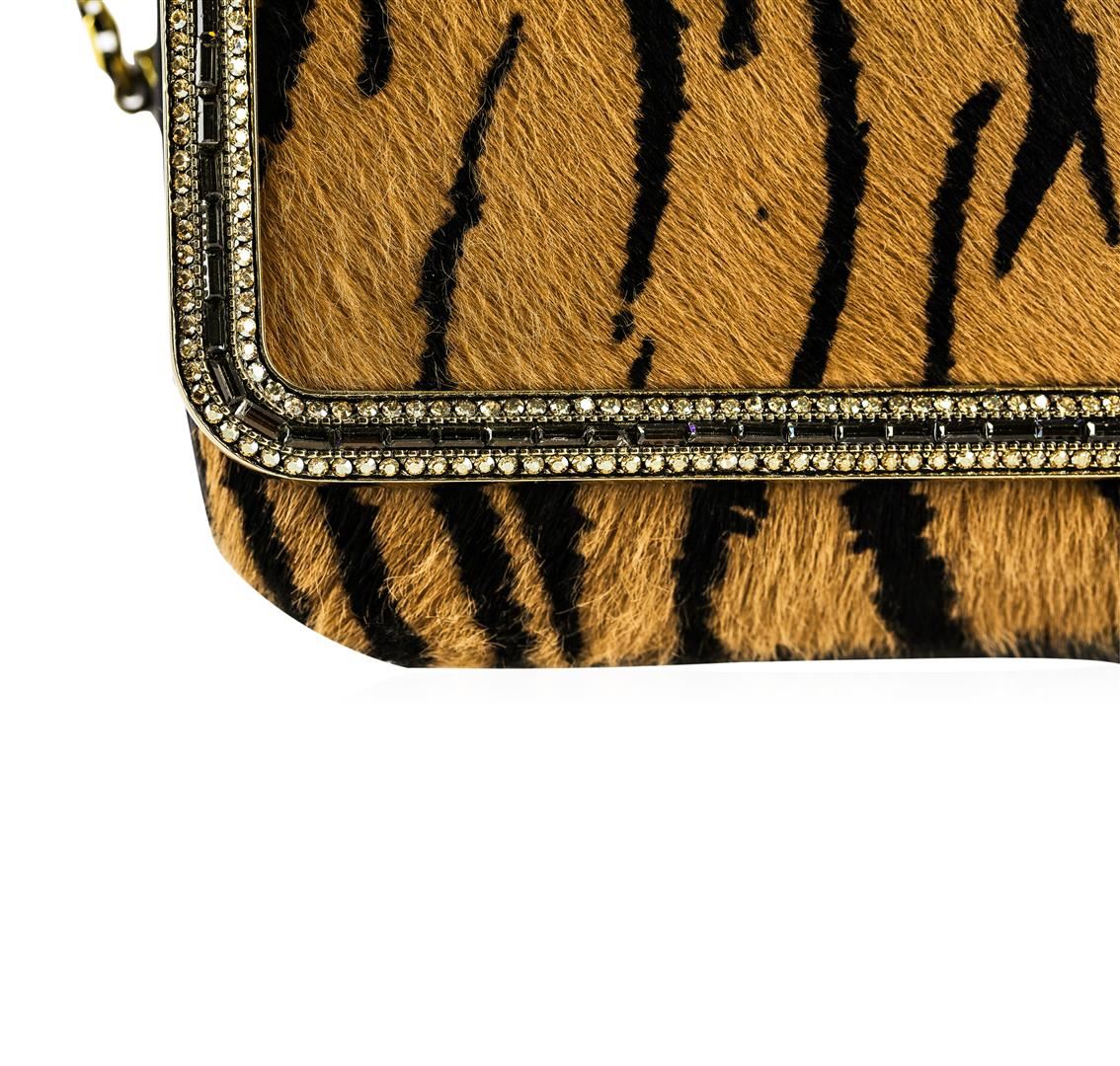 This is new with tags, dust bag and box. Judith Leiber Couture "Carmichael" calf hair clutch bag, tan/black. Details Judith leiber tiger-print dyed calf hair clutch bag. Leather trim; golden hardware. Detachable brassy golden chain strap, 14" drop. Pave rhinestone bar edges magnetic flap. Piping trims gusset sides and bottom. Rectangular east-west silhouette. Inside, satin lining and slip pocket. 5/14"H x 8 1/2" W x 1 1/2" D. "Carmichael" is made in Italy. Sold out everywhere!