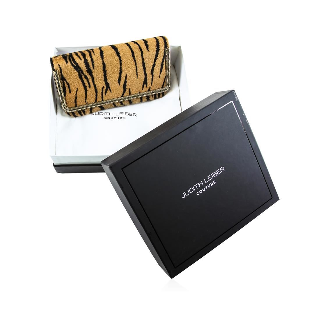 This is new with tags, dust bag and box. Judith Leiber Couture "Carmichael" calf hair clutch bag, tan/black. Details Judith leiber tiger-print dyed calf hair clutch bag. Leather trim; golden hardware. Detachable brassy golden chain strap, 14" drop. Pave rhinestone bar edges magnetic flap. Piping trims gusset sides and bottom. Rectangular east-west silhouette. Inside, satin lining and slip pocket. 5/14"H x 8 1/2" W x 1 1/2" D. "Carmichael" is made in Italy. Sold out everywhere!