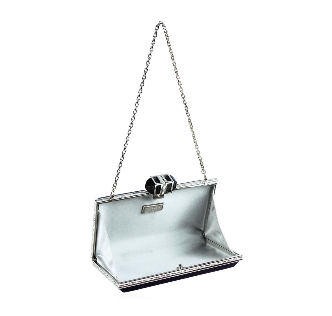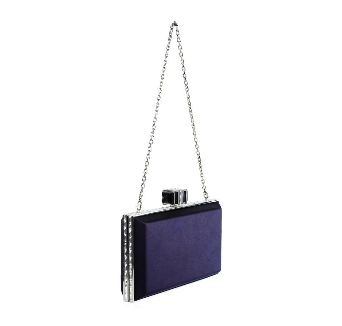 Judith Leiber clutch in satin. Shoulder strap may be tucked in, 8" drop. Framed hard-shell case with crystals. Embellished push-lock clasp at top. Inside, Judith Leiber plaque. Approx. 3.5"H x 6.8"W x 1.5"D. Imported. Comes in Authentic Judith Leiber Couture Box. About Judith Leiber Couture: Begun in 1963, Judith Leiber is an American luxury brand that is synonymous with elegance, style, and sophistication. Each product is executed with meticulous attention to detail and flawless handcraftsmanship. Miniaudierés from the collection are part of the permanent design collections at The Victoria and Albert Museum in London, The Metropolitan Museum of Art in New York, The Smithsonian Institute in Washington, The Houston Museum of Fine Arts and the Los Angeles Museum of Art. Adding to Hollywood's nearly 50-year love affair with the brand, nearly every First Lady dating back to 1953 has carried custom-made Judith Leiber bags to the U.S. Presidential Inauguration ceremonies. Judith Leiber is truly an iconic American brand.