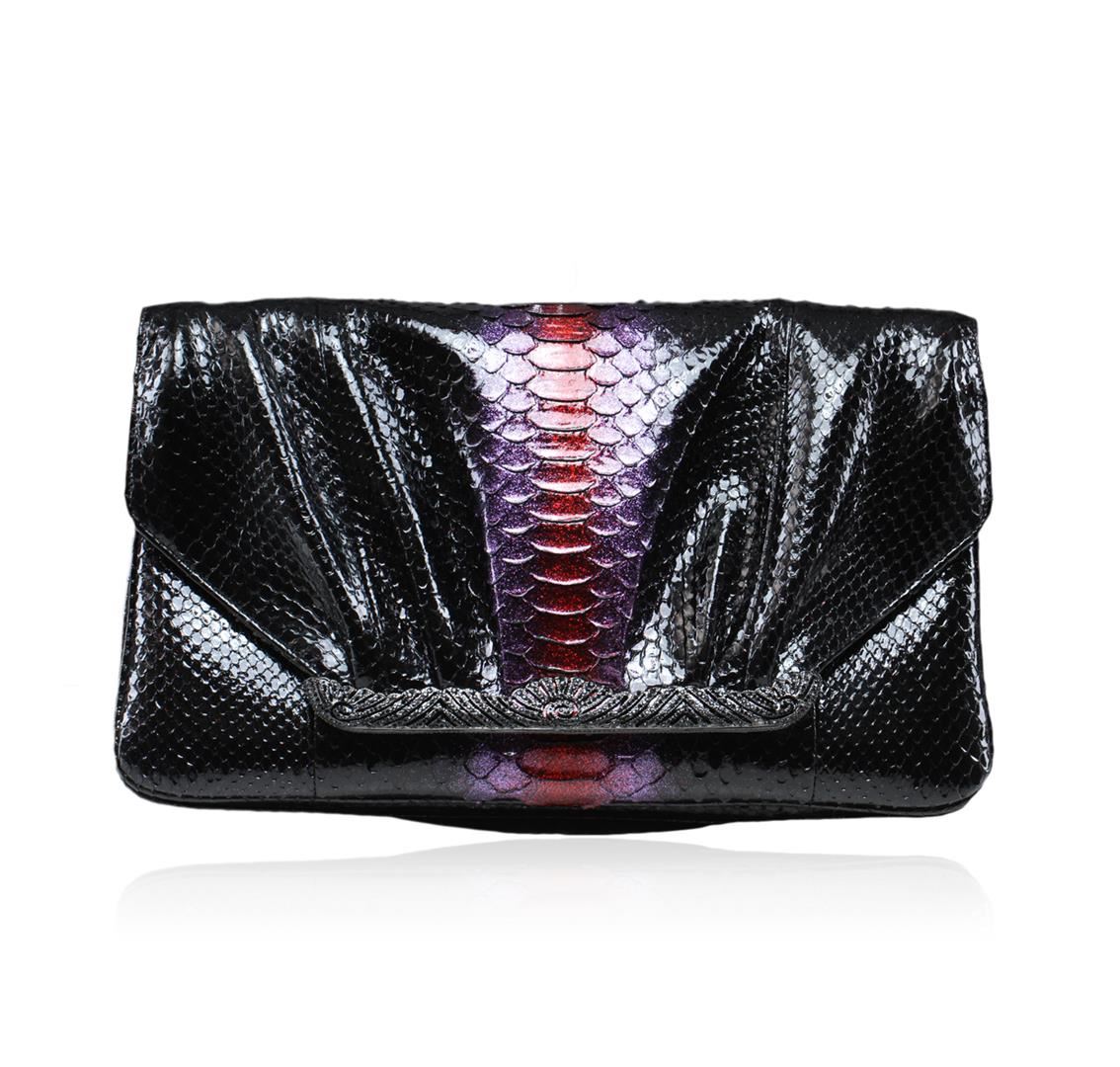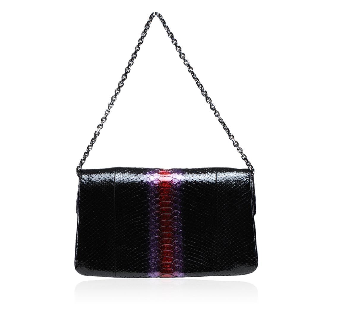 One Judith Leiber Crocodile Skin Bag hand-crafted by skilled artisans using only the finest quality materials featuring: Red, purple, and black crocodile; Magnetic snap closure, One interior pocket; Chain like handle. Made in Italy. Comes with dust cover.