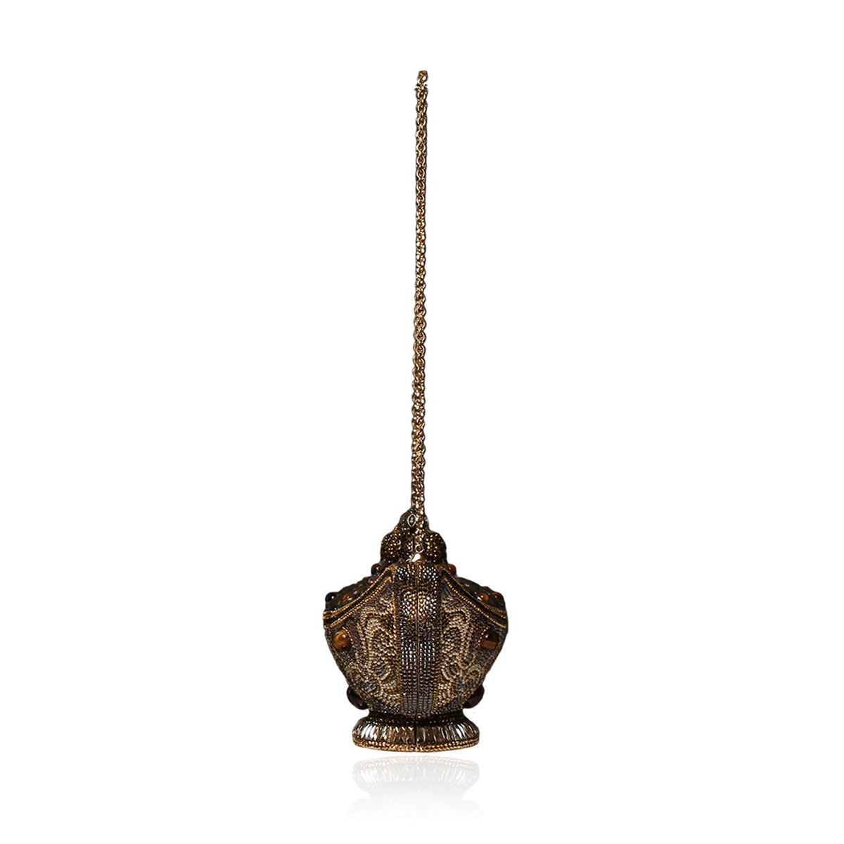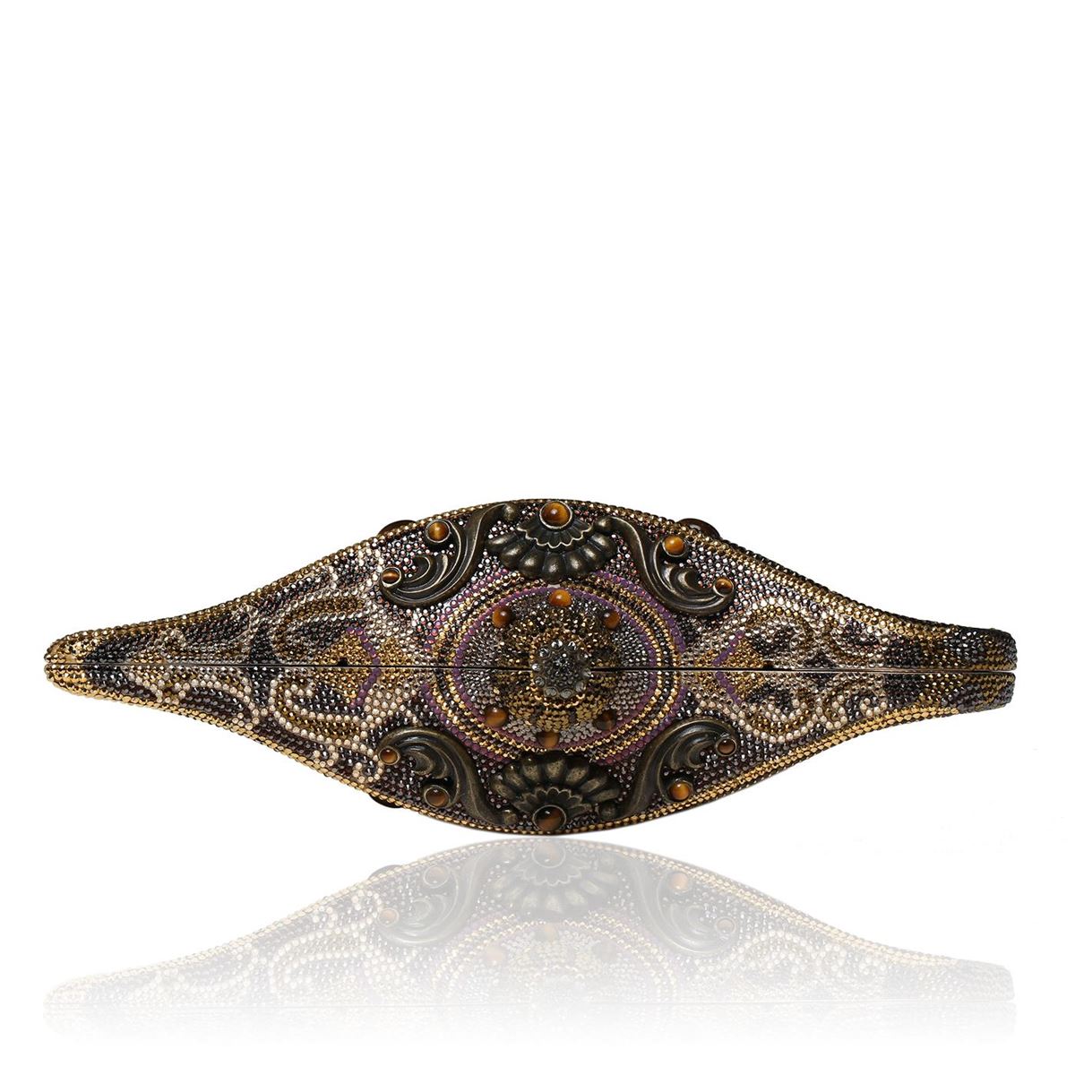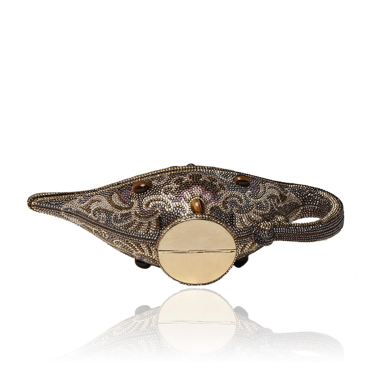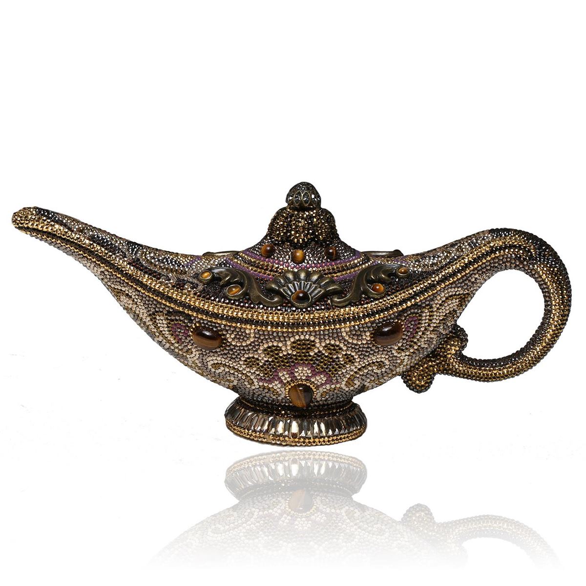 One Judith Leiber Habibi Genie Lamp minaudiere clutch decorated in tiger's eye and semiprecious stone mixed with multi-sized crystals. This iconic in-hand statement features a push-lock clasp and gold tone chain. Measures 9.5 x 4.375 x 3 inches. Comes with box.