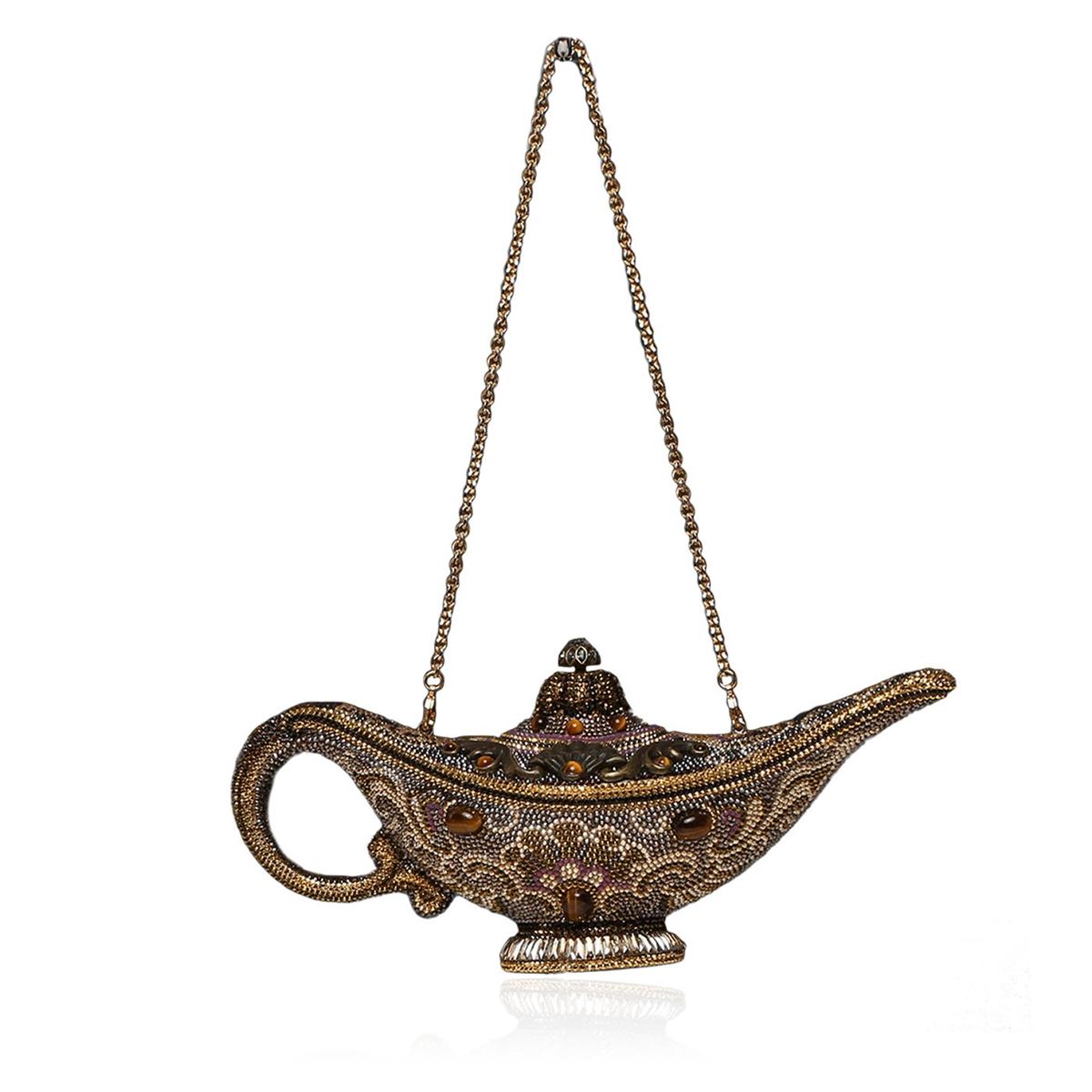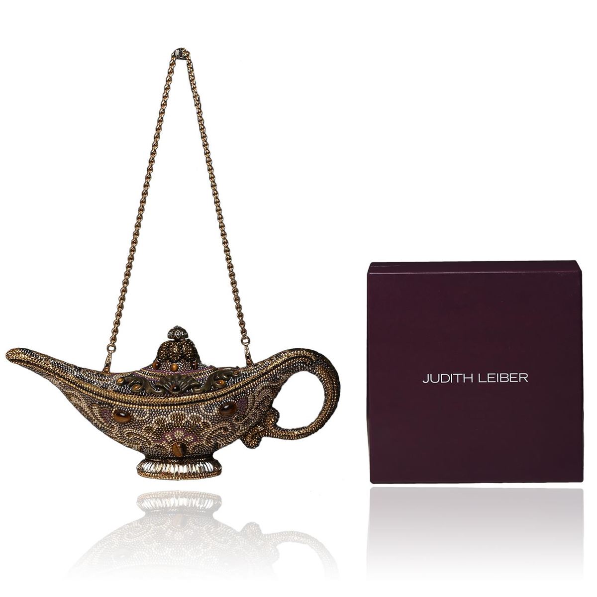 One Judith Leiber Habibi Genie Lamp minaudiere clutch decorated in tiger's eye and semiprecious stone mixed with multi-sized crystals. This iconic in-hand statement features a push-lock clasp and gold tone chain. Measures 9.5 x 4.375 x 3 inches. Comes with box.