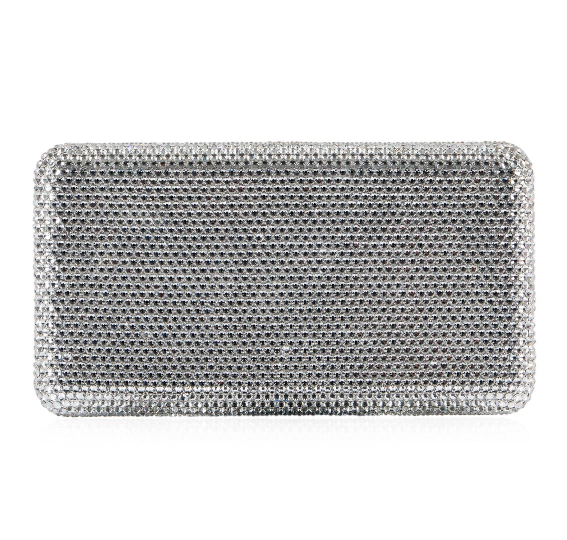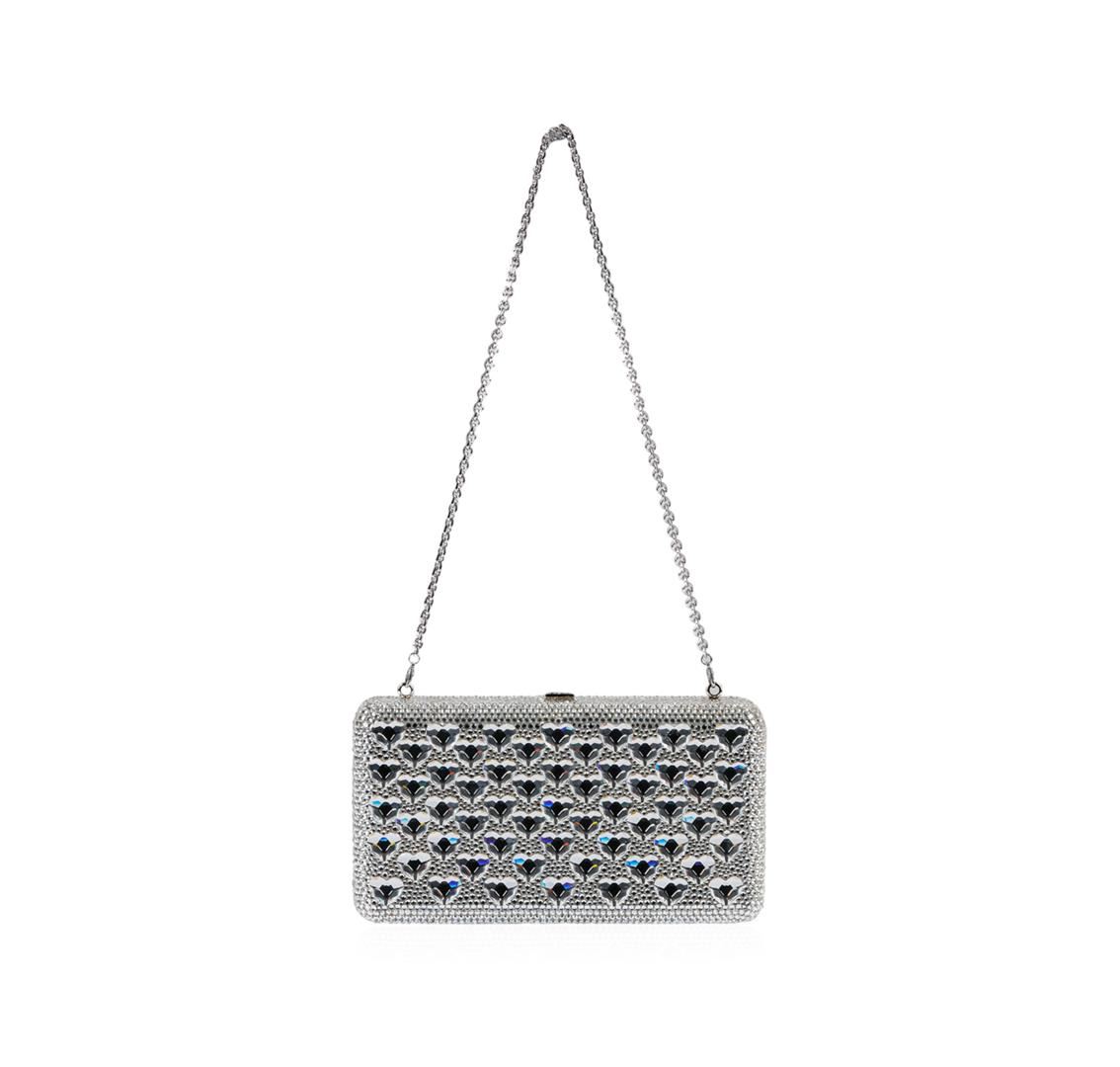 This NEW Judith Leiber Couture Crystal Minaudiere evening bag comes with its original box and dust bag. The bag features stunning clear crystals with hearts. The bag measures 6.5" x 3.75" x 1.5" and can be converted from a clutch to a bag with chain.