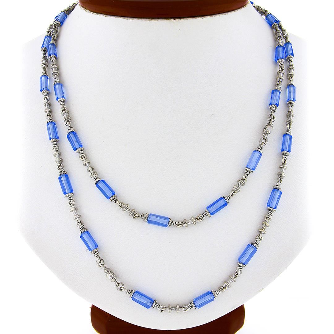 A solid 18k white gold long chain necklace by Judith Ripka, featuring 34 faceted tube shape w/ drilled center natural blue topaz (8.3x4.2mm each), and 4 round brilliant cut natural diamonds (G/H - VS1/VS2 ; 0.12ctw). It weighs a total of 42.47 grams, measures 4.2mm wide, and measures 36 inches in length.