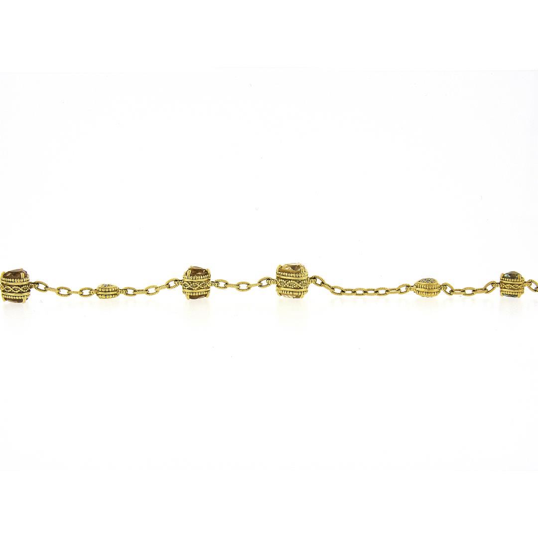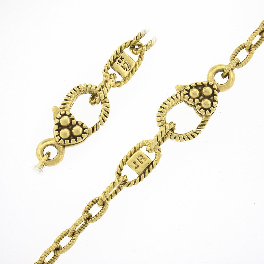 A solid 18k yellow gold by the yard necklace by Judith Ripka, Featuring 28 heart cut multi gemstones (7x7mm to 5x5mm each), and 88 round brilliant cut natural diamonds (E/F - VVS2/VS1 ; 0.88ctw). It weighs a total of 64.09 grams, measures 9.3mm wide, and measures 35 inches in length.
