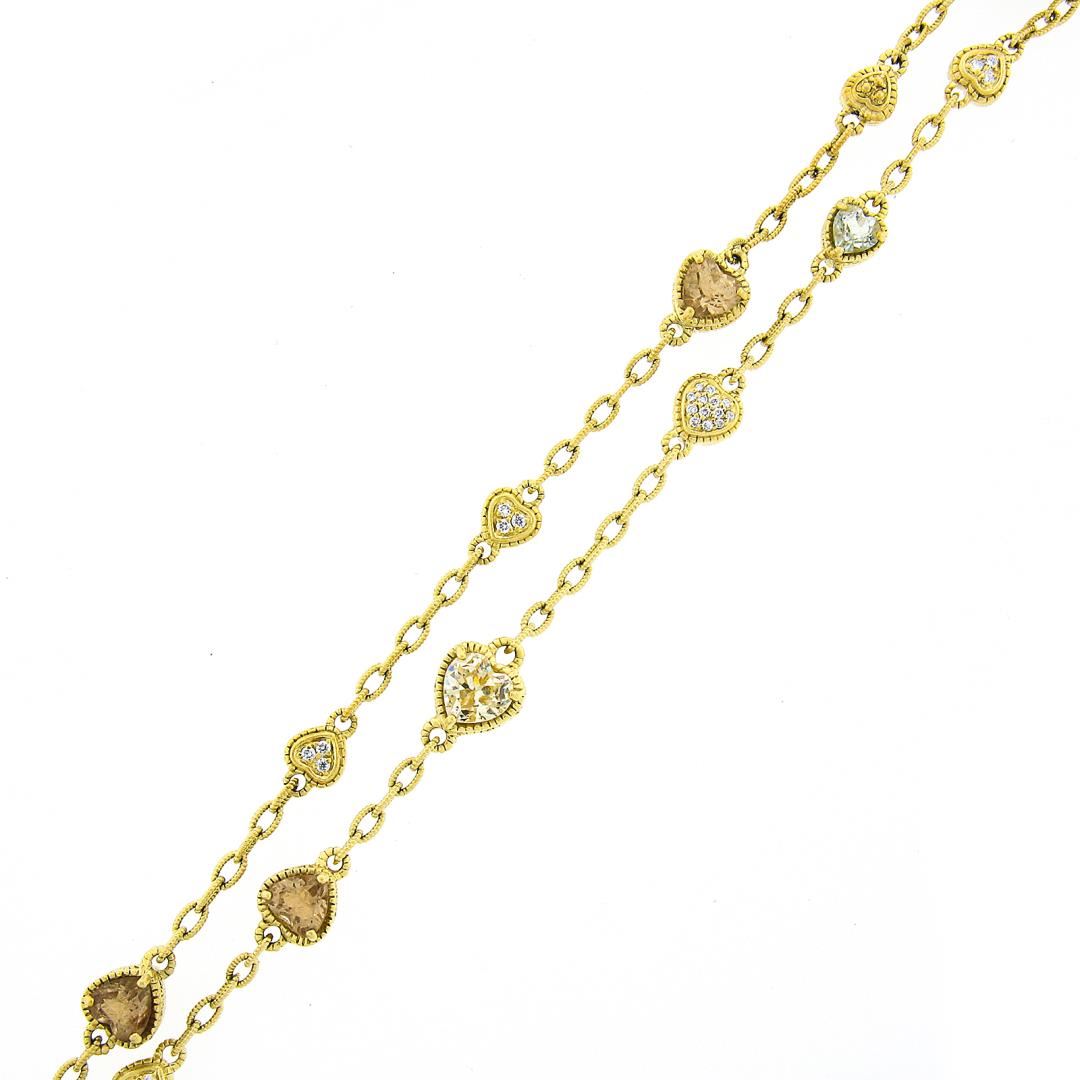 A solid 18k yellow gold by the yard necklace by Judith Ripka, Featuring 28 heart cut multi gemstones (7x7mm to 5x5mm each), and 88 round brilliant cut natural diamonds (E/F - VVS2/VS1 ; 0.88ctw). It weighs a total of 64.09 grams, measures 9.3mm wide, and measures 35 inches in length.