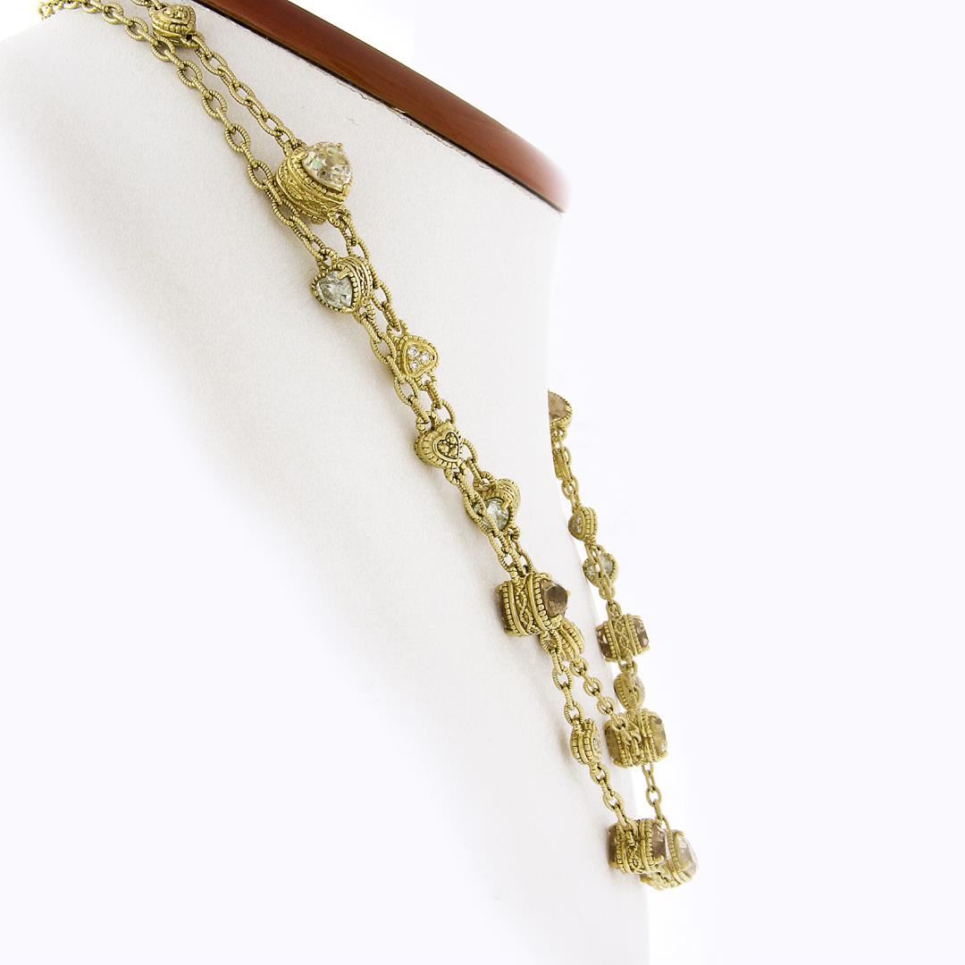 A solid 18k yellow gold by the yard necklace by Judith Ripka, Featuring 28 heart cut multi gemstones (7x7mm to 5x5mm each), and 88 round brilliant cut natural diamonds (E/F - VVS2/VS1 ; 0.88ctw). It weighs a total of 64.09 grams, measures 9.3mm wide, and measures 35 inches in length.