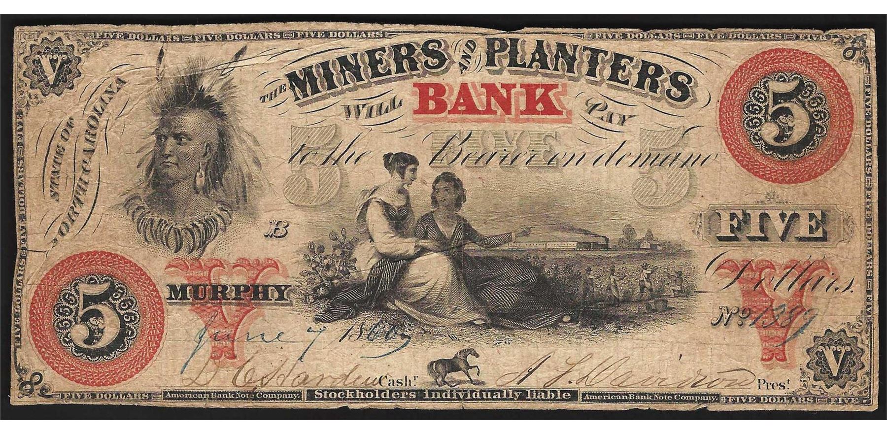 One June 7, 1860 $5 The Miners & Planters Bank Obsolete Note. An Indian warrior shares space with two maidens observing slaves working in the fields on this red-and-black note printed by ABNCo that was issued on the eve of the Civil War.
