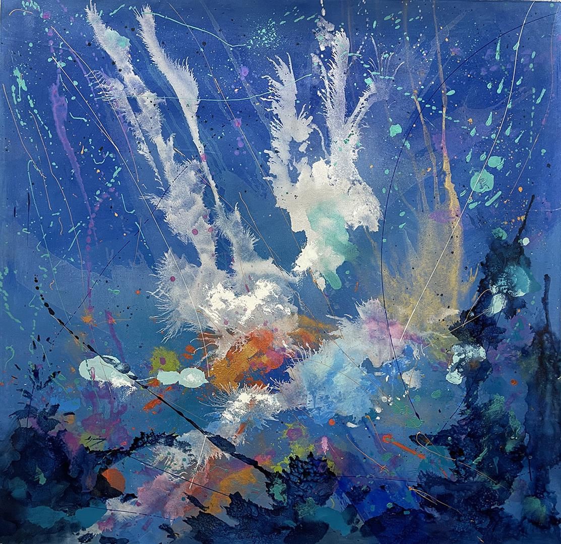 Eye-Catching original acrylic on canvas. Hand signed by artist. This artwork comes rolled ready to stretch. Approximately 60x60 inches