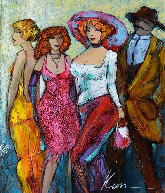 Artist: Elena Kanevsky - Title: Our Night Out - Medium: Original Acrylic on Canvas - Signature: This one-of-a-kind work is hand-signed by the artist at the bottom of the image - Image Size: Approximately 24 inches x 20 inches - Unframed on Unstretched Canvas -