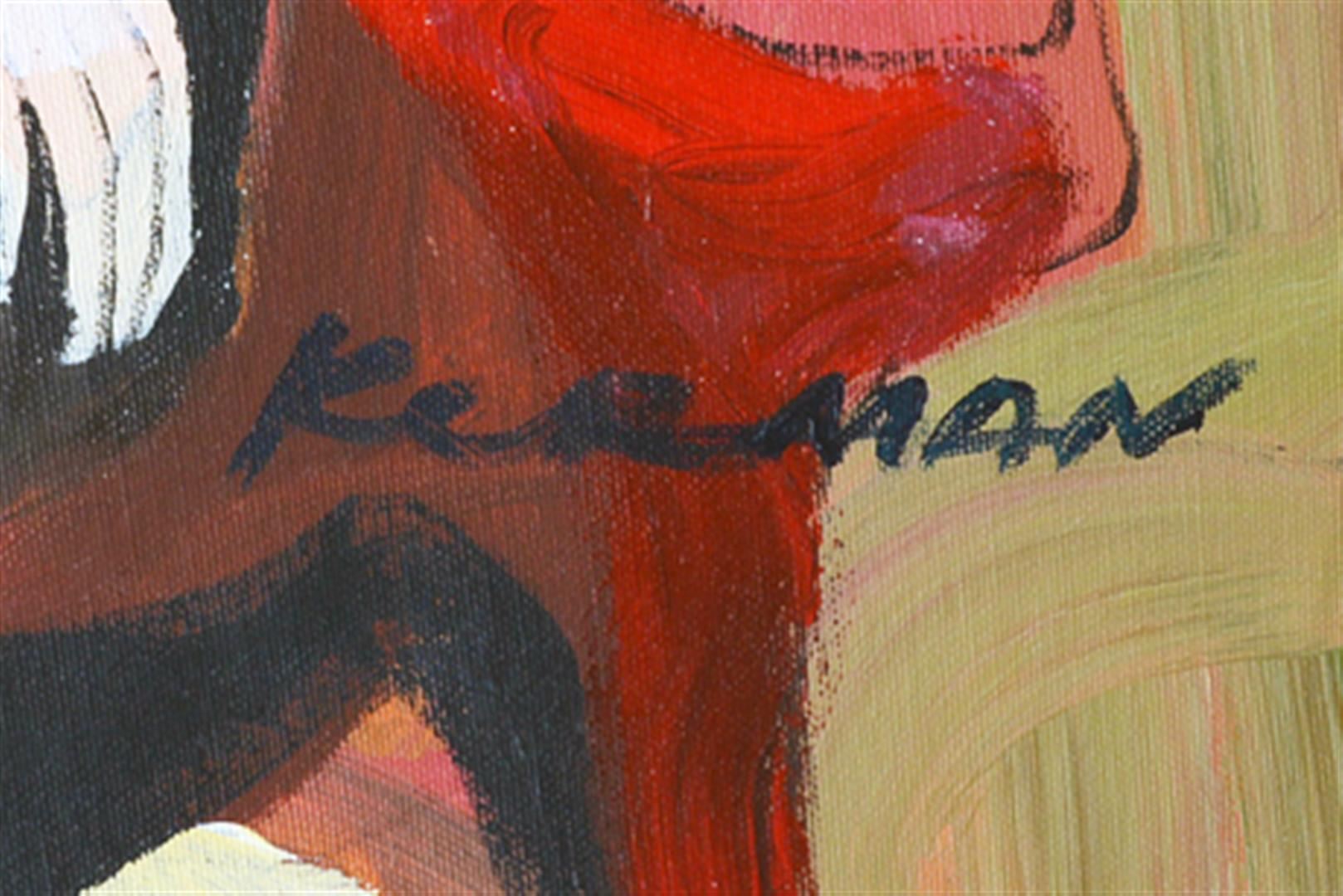 Artist: Michael Kerman - Title: Outside Refreshments - Medium: Original Acrylic Canvas - Signature: This one-of-a-kind work is hand-signed by the artist at the bottom of the image - Image Size: Approximately 24 inches x 30 inches - Unframed on Unstretched Canvas - Details: This work comes with a Certificate of Authenticity - Biography: Michael Kerman was born in Ukraine in 1964 to Wolf Kerman, a well-known painter. In 1982, he graduated from the local Art School and in the same year, he was accepted into the 'Kiev High Academy of Arts' from which he graduated with honors. In 1986, he joined a group of dissident artists who created and exhibited all over Europe. Kerman's painting is strongly influenced by the postimpressionists, particularly Matisse. -