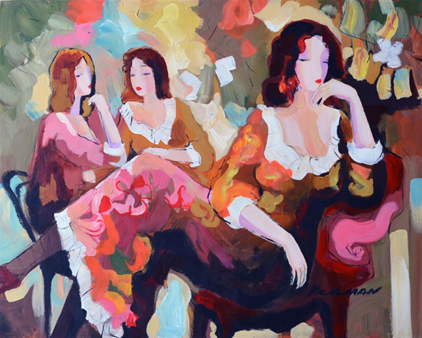 Artist: Michael Kerman - Title: Outside Refreshments - Medium: Original Acrylic Canvas - Signature: This one-of-a-kind work is hand-signed by the artist at the bottom of the image - Image Size: Approximately 24 inches x 30 inches - Unframed on Unstretched Canvas - Details: This work comes with a Certificate of Authenticity - Biography: Michael Kerman was born in Ukraine in 1964 to Wolf Kerman, a well-known painter. In 1982, he graduated from the local Art School and in the same year, he was accepted into the 'Kiev High Academy of Arts' from which he graduated with honors. In 1986, he joined a group of dissident artists who created and exhibited all over Europe. Kerman's painting is strongly influenced by the postimpressionists, particularly Matisse. -